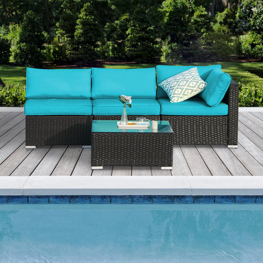 4 Pieces Outdoor Sectional Set with Coffee Table, Turquoise Cushions