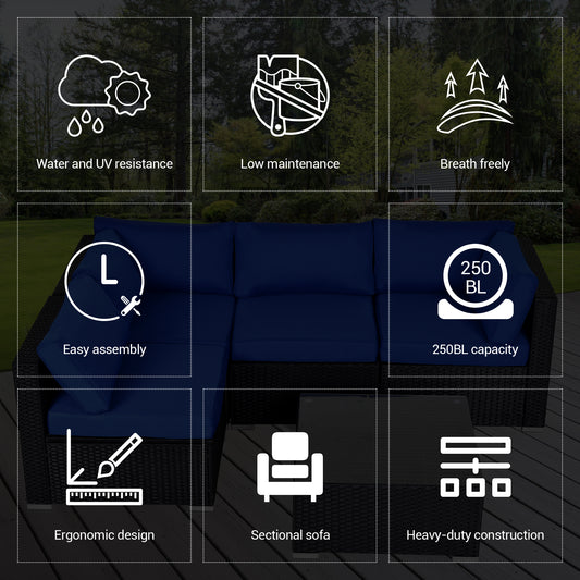 5 Piece Sectional Set with Coffee Table, Navy Blue Cushions