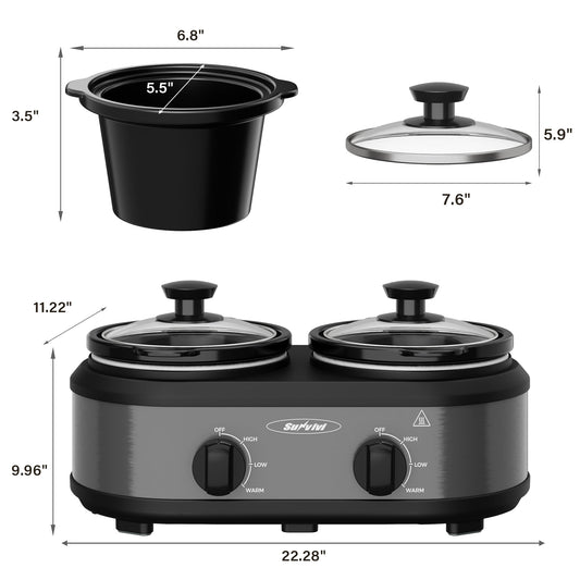 Sunvivi Small Double Slow Cooker, 2 Pot 1.25 Quart Oval Crock Food Warmer Buffet Server, Stainless Steel, Gray