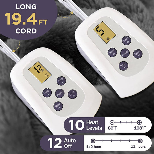 Royalcraft Electric Blanket Queen Size 84"x90" Flannel Heated Throw Blanket, Dual Controls Setting Electric Blanket, 10 Heating Levels, 12H Auto-off, Grey