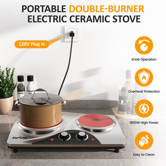 Sunvivi Dual 1800W Burner Electric Ceramic Stove - Knob Control, Indicator Light - Silver