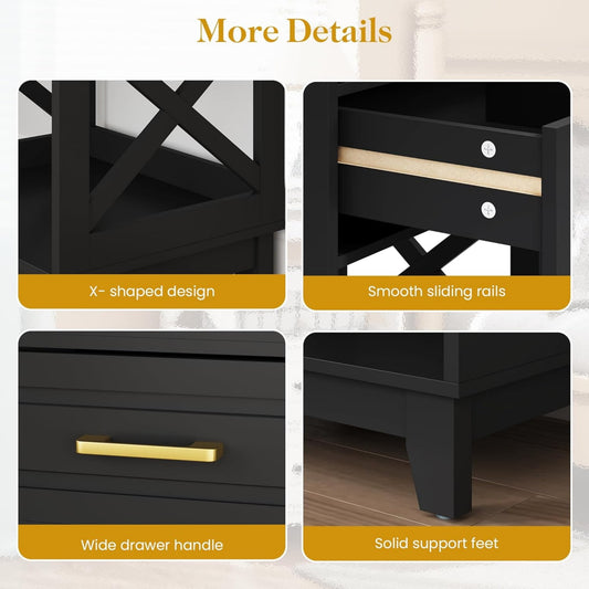 CozyHome Tall Nightstand Set of 1, Side Table with 2 Drawers and Open Shelf Below, Bedside Table with Solid Feet, Modern Night Stand End Table for Bedroom, Living Room, Home Office, Black