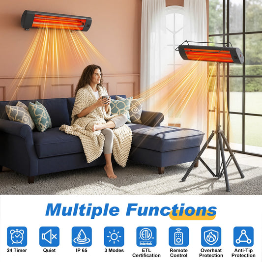 Heynemo Patio Heater for outdoor/Indoor Use, 1500W Electric Infrared Heater with 24H Timer, IP65 Waterproof, Tip-over Protection, Electric Outdoor Heater with Tripod for Garage, Backyard