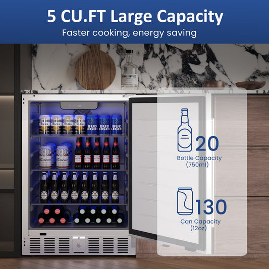 Heynemo 24 Inch Indoor/Outdoor Beverage Refrigerator (32-50¨H), Silver Under Counter Drink Fridge for Patio, Office, Kitchen, Bar, Built-in/Freestanding Can Cooler with Lock & 3 Adjustable Shelves