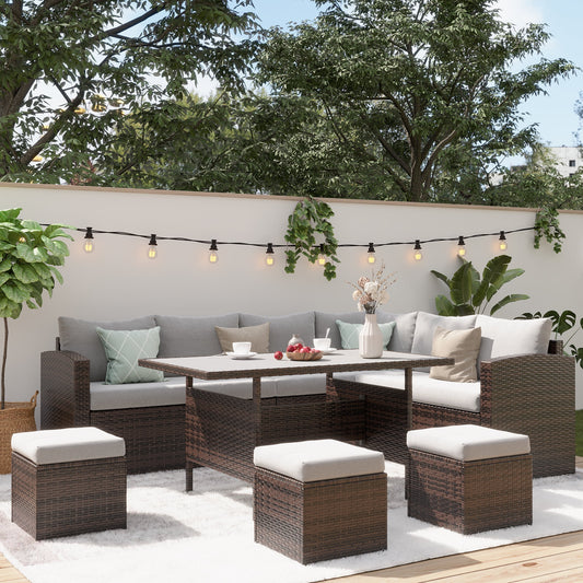 Patio Furniture Set, 7 Piece Outdoor Wicker Patio Furniture with High Curved Back Dining Sectional Sofa, Dining Table, Ottomans and Cushions, All Weather Conversation Set, Grey