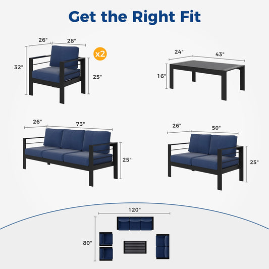 Heynemo Aluminum Outdoor Patio Furniture Set, 7 Seats Modern Patio Sectional Sofa Conversation Set, Outdoor Seating Set with Coffee Table for Deck Garden Backyard, Blue