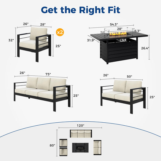 Heynemo Aluminum Outdoor Patio Furniture Set, 7 Seats Modern Patio Sectional Sofa Conversation Set, Outdoor Seating Set with Fire Pit Table for Deck Garden Backyard, Beige