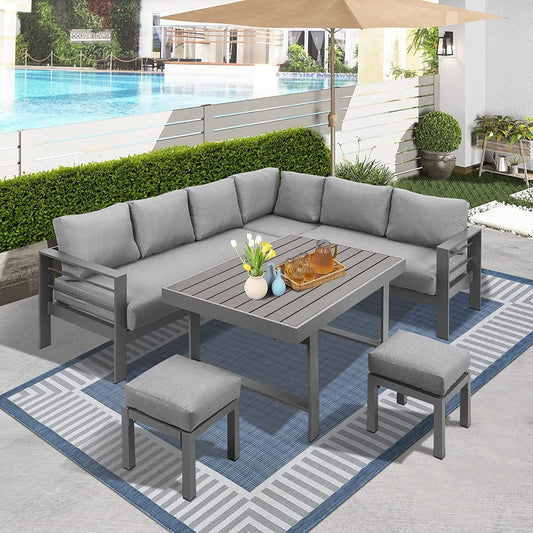 Heynemo Superjoe Aluminum Outdoor Patio Furniture Set, Metal Outside Conversation Sets with Dining Table&2 Ottomans, Sectional Sofa Couch Seating Set with Cushion for Backyard, Gray