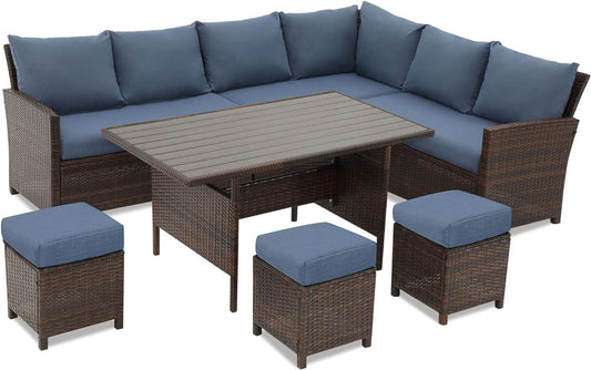 Superjoe 7 Pcs Outdoor Patio Furniture Set Dining Sectional Sofa with Table and Chair All Weather Wicker Conversation Set with Ottoman, Blue