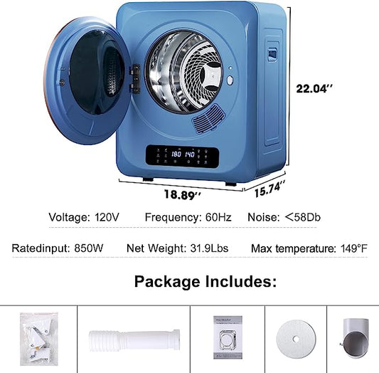 Portable Dryer for Apartments, Front Load 120 V Electric RV Dryer with Smart Moisture Sensor, LCD Control Panel Tumble Portable Clothes Dryer Machine with Stainless Steel Drum for Apartment, Dorm and Home, Size 1.6 cu.ft, Blue 850W