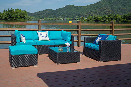 7 Piece Outdoor Rattan All Weather Sectional Sofa with Turquoise Cushions