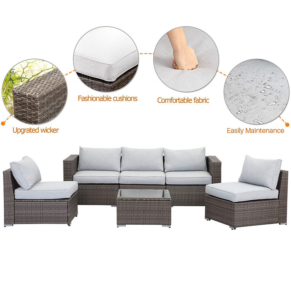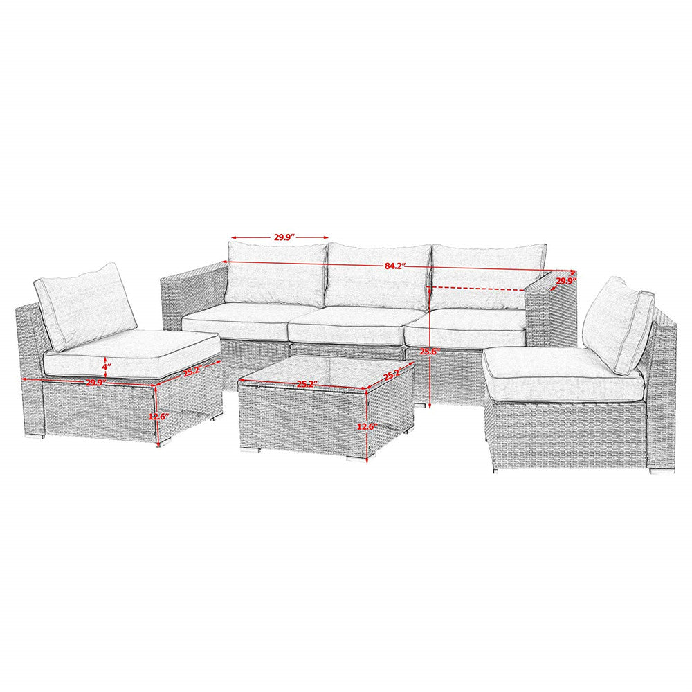 PRODUCT SIZE- 6 piece wicker outdoor patio sectional furniture?set comes with 2 corner sofas, 3 single sofas, 1 coffee table with tempered glass, and 5 comfort cushions -Single sofa: 25.2" x 29.9' x 25.6???, Corner sofa: 29.5??I x 29.9??? x 25.6??I, Table: 25.2??? x 25.2??I x 12.6???.