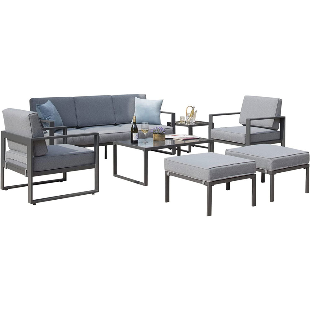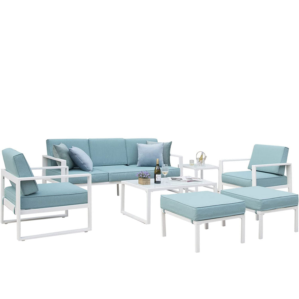INCLUDING- This aluminum outdoor furniture set includes: 2 x armchairs, 1 x 3-seat sofa, 1 x coffee table, 1 x side table, and 2 x ottomans. Every moment spent on this set is going to be worth it