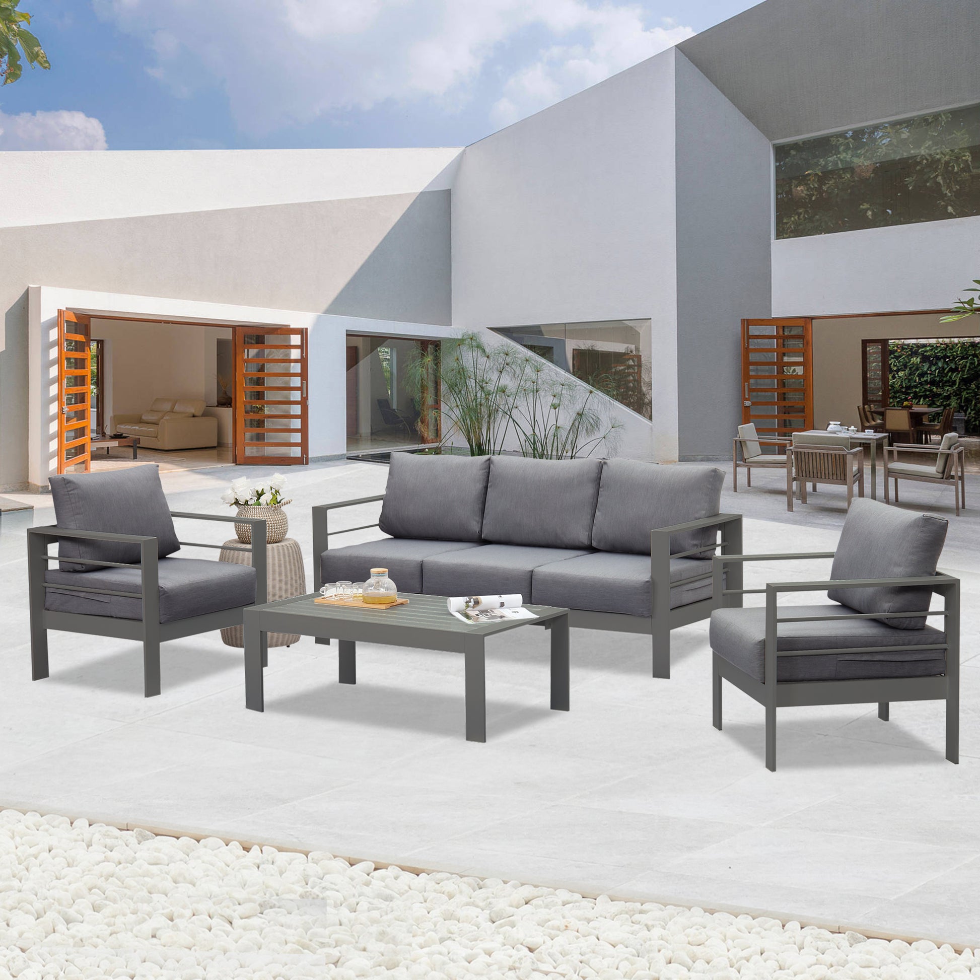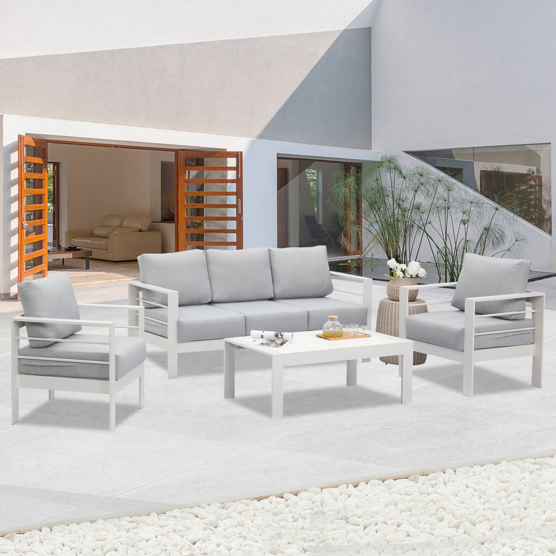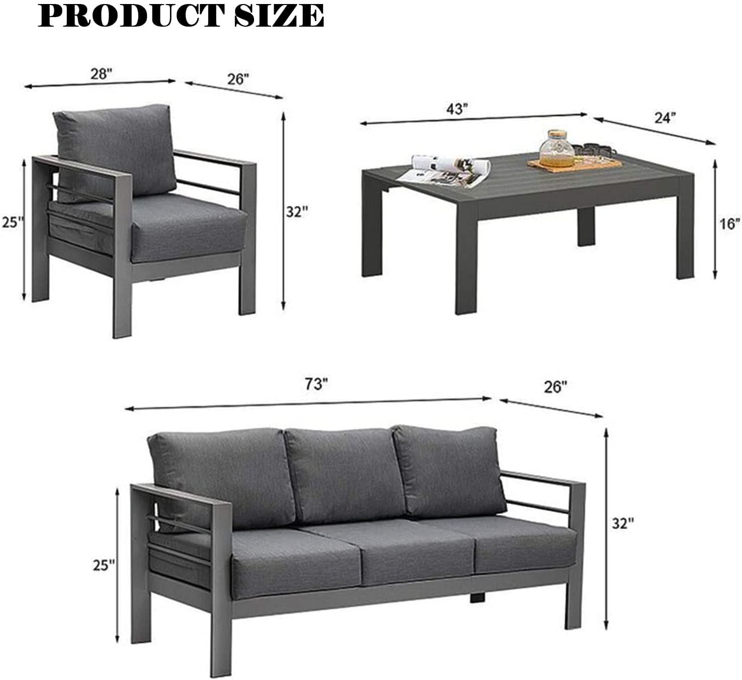 WIDENED BASE- The aluminum outdoor patio set understated frame has a straightforward silhouette with wide geometric angles armrests, streamlined backrest, slatted seat base, and 4 sofa legs, making a modern statement in any outdoor space. The solid baseplate of the patio furniture sofa with parallel arrangement slats supports a maximum weight of 300 per seat.