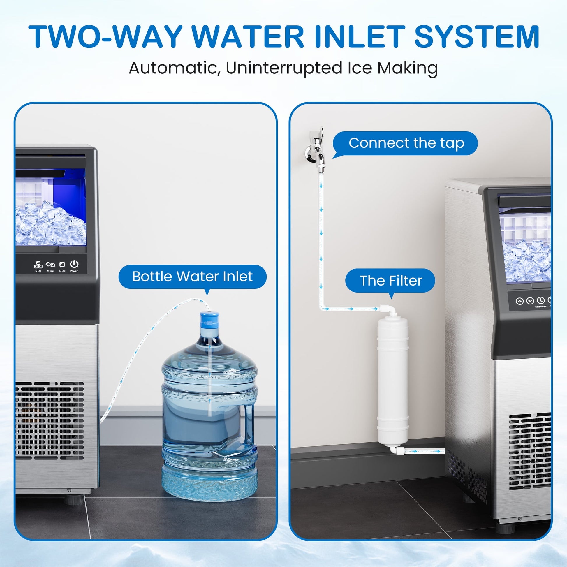 Experience the ultimate convenience with our high-capacity ice maker, designed to meet all your ice needs with speed and reliability. Producing up to 110 lbs of crystal-clear ice daily, this machine is perfect for large gatherings, busy bars, or restaurants. Enjoy fresh ice in just 8-15 minutes, with intelligent digital controls for precise timing and energy-efficient operation. The self-cleaning function and dual water supply (bottled or tap) make it versatile and easy to maintain, ensuring hassle-free use in homes, offices, or businesses. The spacious 11 lbs storage bin keeps ice on hand for continuous use, so your guests always have perfectly chilled drinks. Effortless setup, long-lasting performance, and consistent results ¨C this ice maker adds convenience and reliability to your daily life.