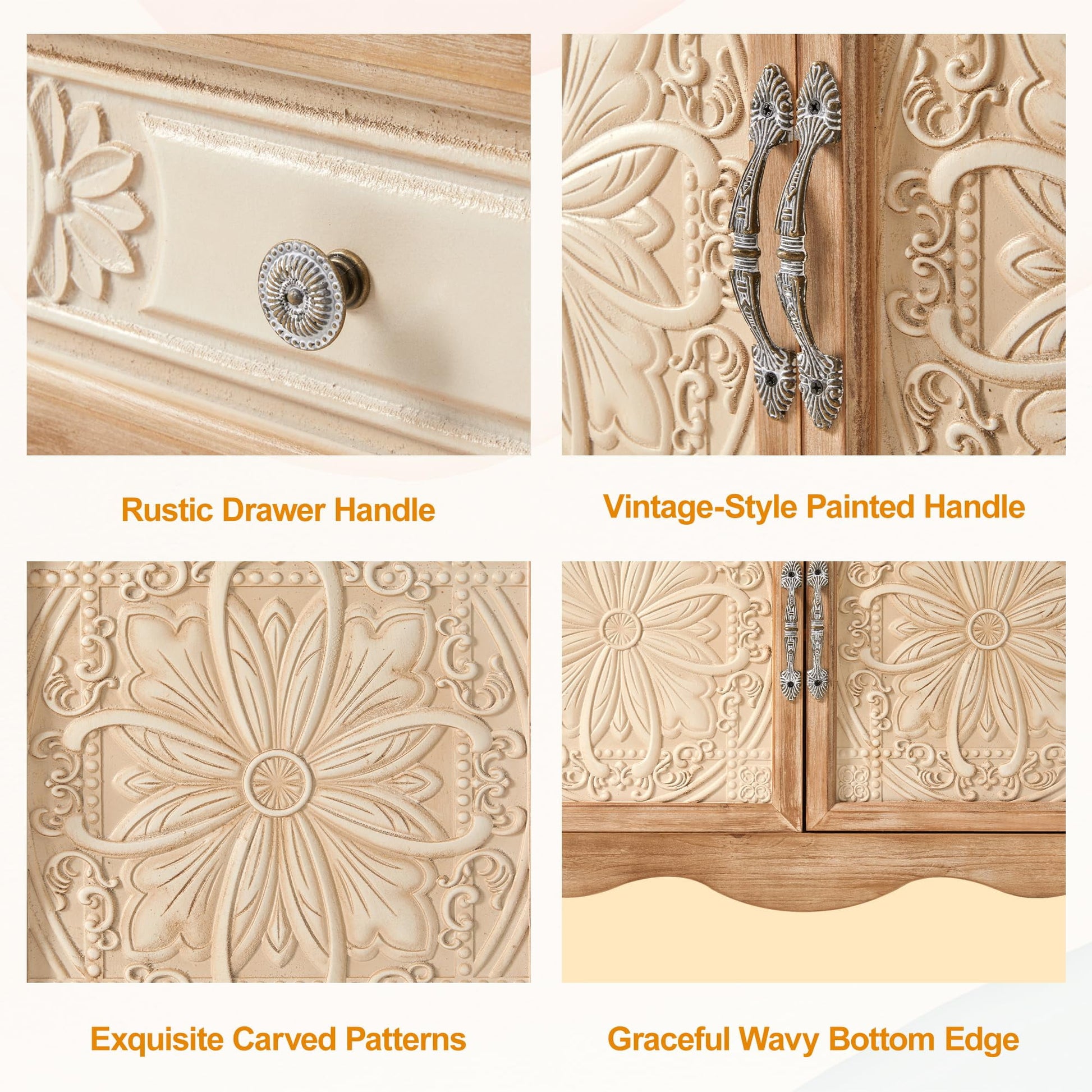 ?- Rustic Elegance and Charm: Featuring detailed carvings and a vintage finish, our storage cabinet has a graceful wavy bottom edge and a soft beige hue, adding a warm, rustic flair to any space. Ideal for farmhouse and country-style interiors.