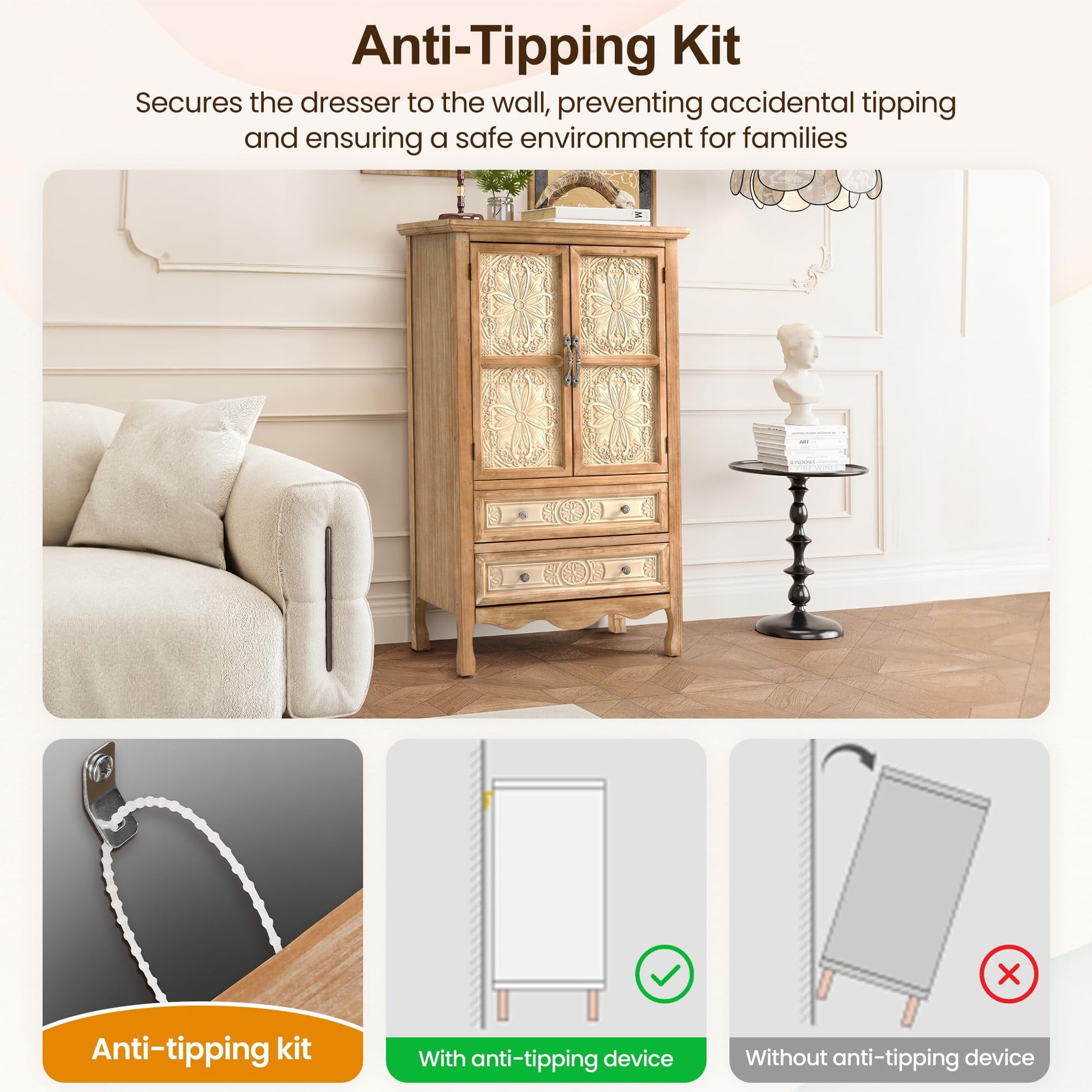 Transform your space with our rustic storage cabinet! With its detailed carvings and vintage beige finish, this kitchen cabinet adds a cozy, farmhouse feel to any room. 2 spacious shelves and 2 drawers make it easy to store and find your essentials. Perfect for dining rooms, living rooms, or kitchens, this wood cabinet not only looks great but is also safe and sturdy. Plus, assembling it is a breeze with clear instructions.?
