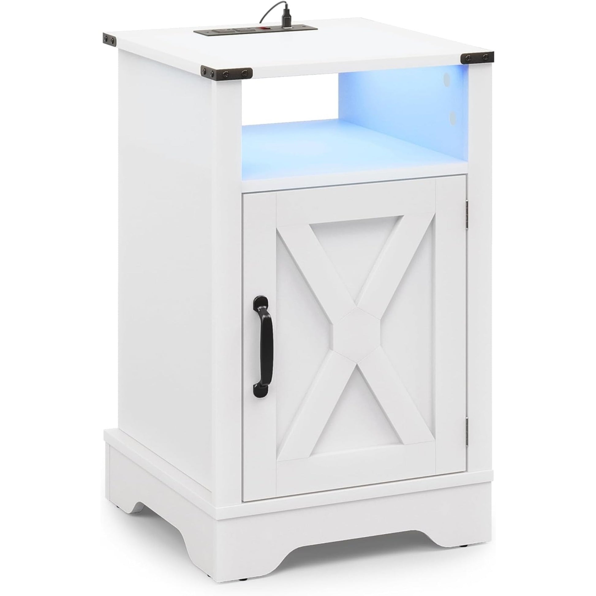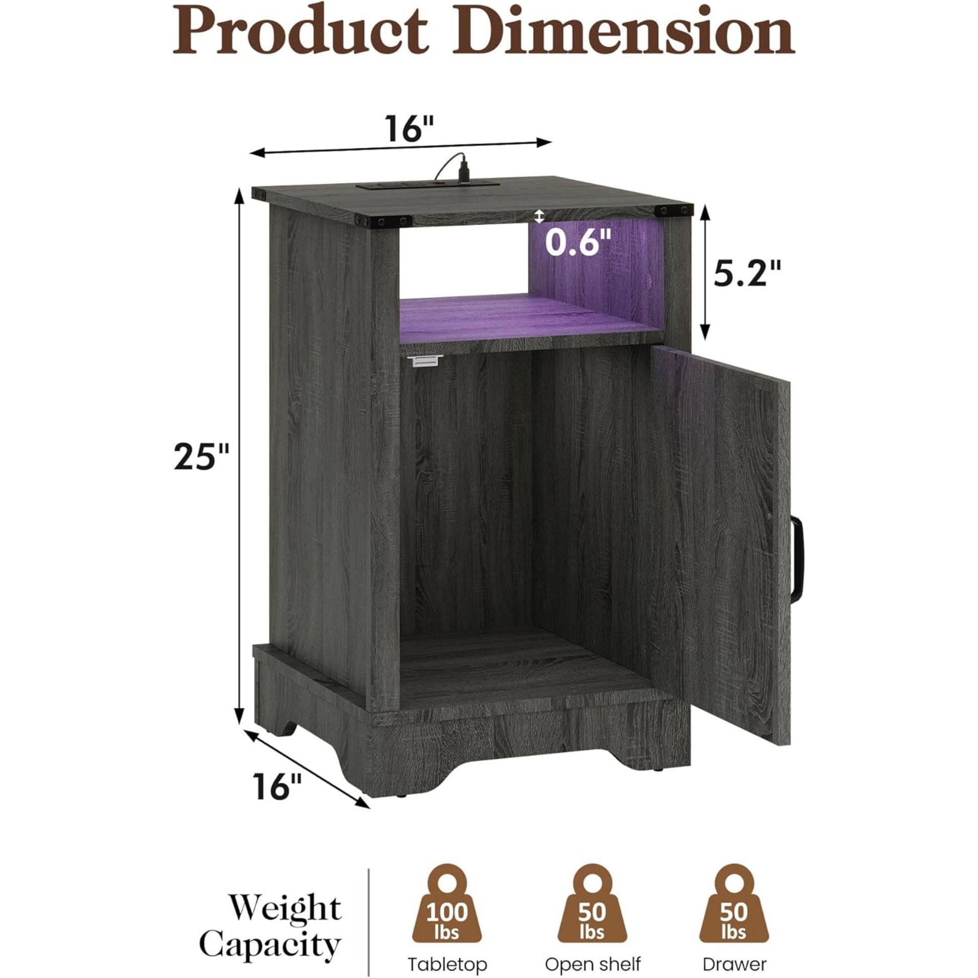 Elevate your space with our farmhouse wooden side table featuring RGB LED lights. Effortlessly switch between 7 vibrant colors, adjust brightness, or set a gradient mode with the included remote control. This table's built-in charging station includes 1 power switch, 2 AC outlets, and 2 USB ports, allowing you to charge up to 4 devices simultaneously with its 6.6-foot cord. Measuring 16"D x 16"W x 25"H, it offers ample storage with a bottom closed cabinet, a middle open shelf, and a spacious countertop. Crafted from durable MDF, this table is both practical and stylish, and easy to assemble with clear instructions and dedicated customer support.