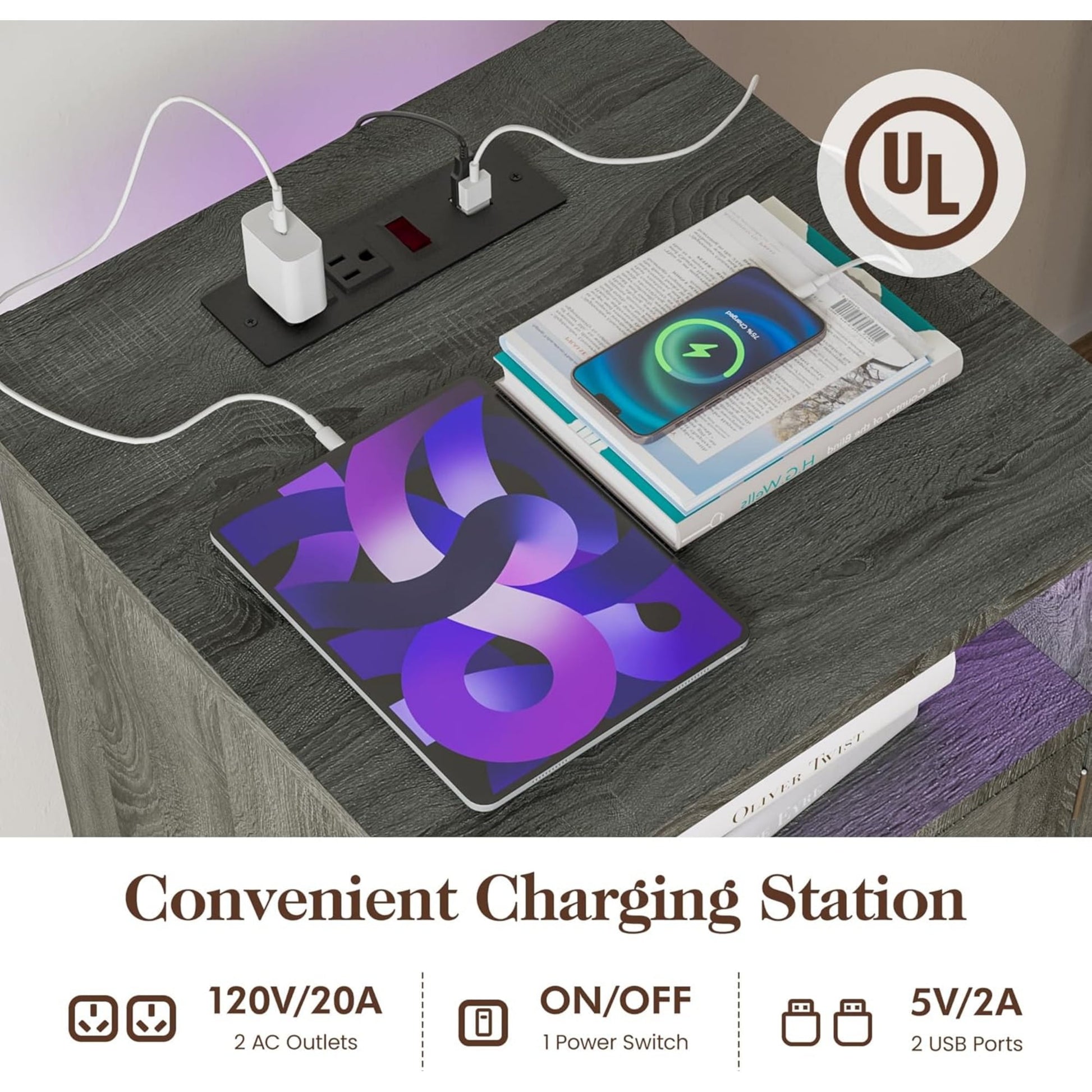 CozyHome LED Nightstand with Charging Station, Farmhouse Wooden Side Table, Bedside Table with Storage Cabinet and Shelf, Rustic End Table for Bedroom, Living Room, Grey