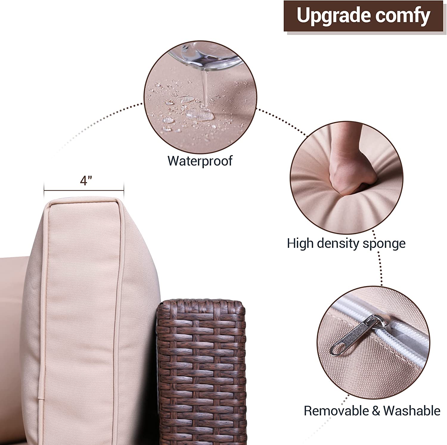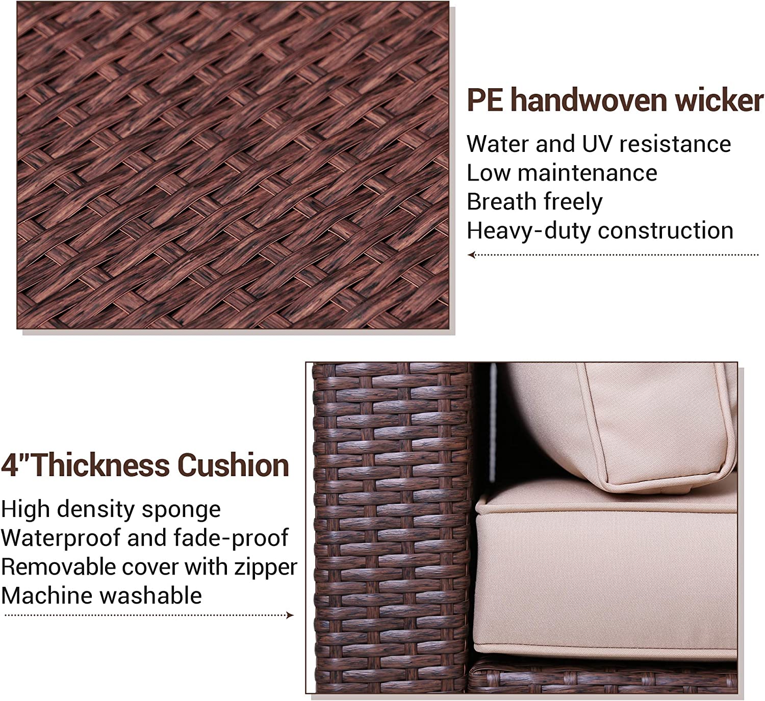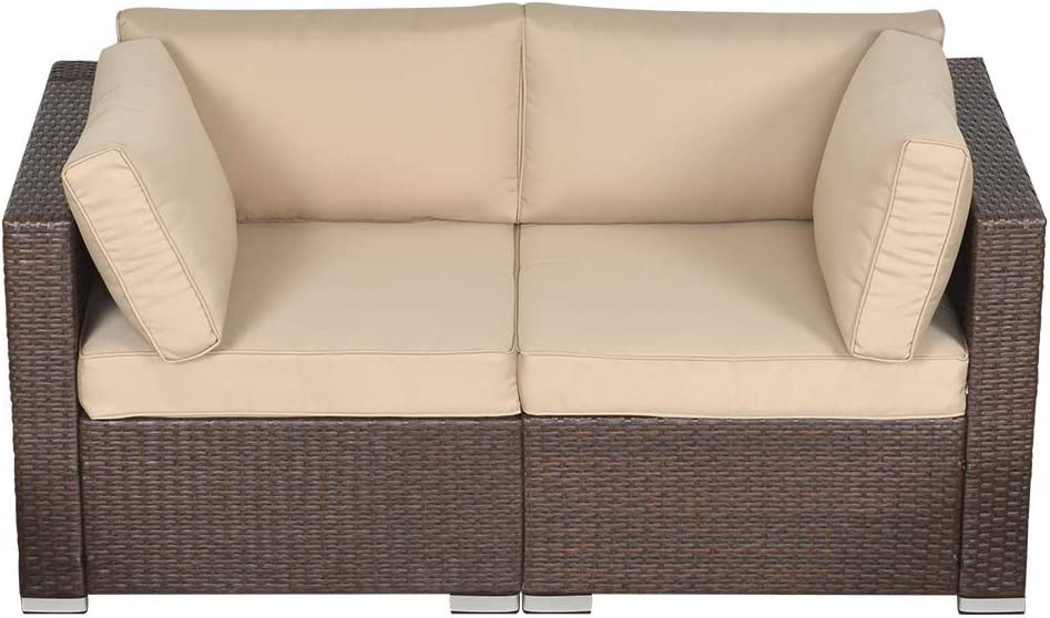 Upgraded Comfort The thick cushions are padded with high-density lofty sponge (250g polyester) for good elasticity and breathability. UV-protected and waterproof olefin fabric cover to protect against the outdoor elements. The high backrest fits the curves of the body and the wide armrests are at the right height. What a wonderful thing it is to sit on a comfortable sofa on a sunny afternoon with a cup of tea and a book and enjoy a leisurely afternoon.