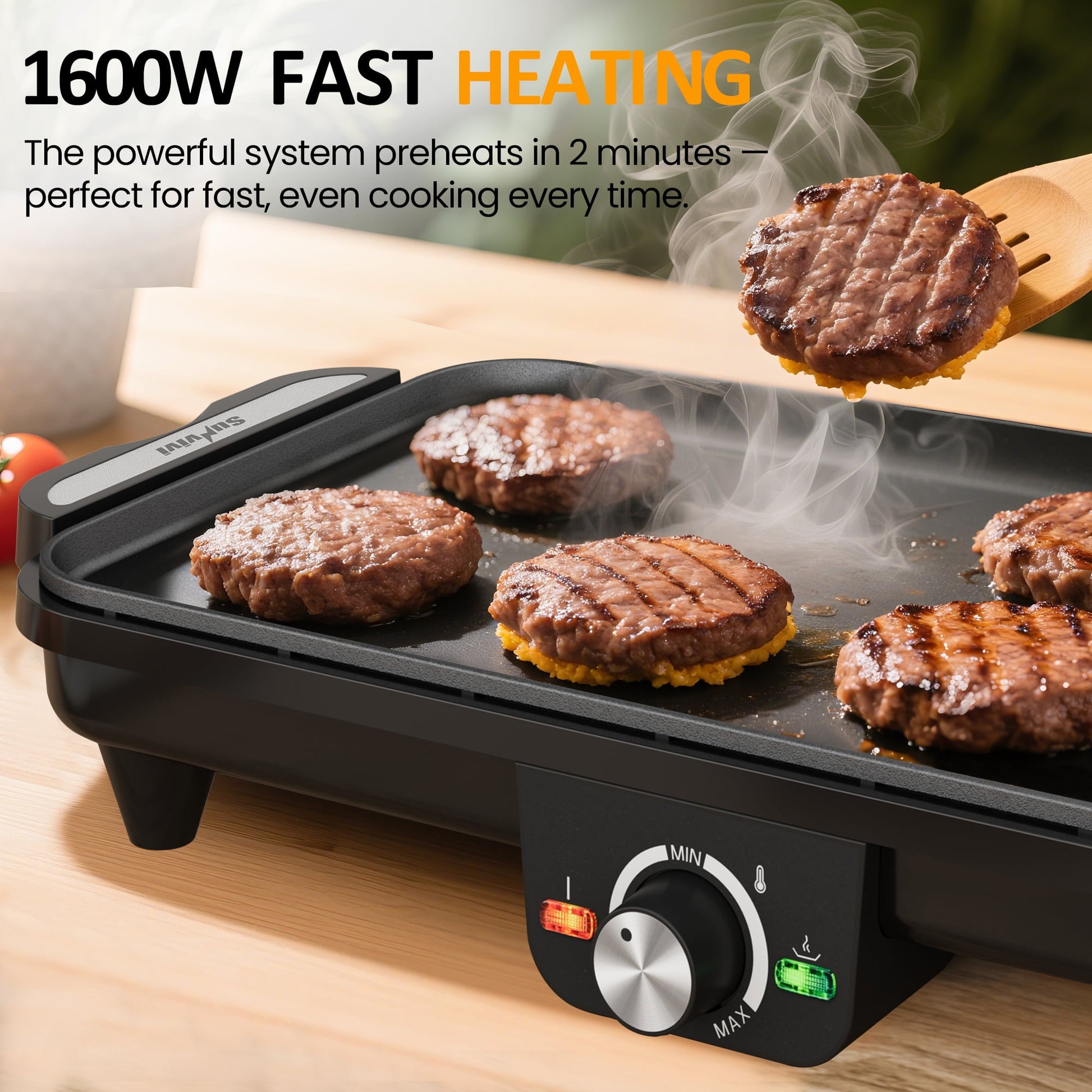 Unleash your culinary creativity with the independent dual temperature knobs¡ªperfect for cooking eggs and steak simultaneously at their optimal heat. The spacious 180¡ã flat griddle plate lets you prepare a full meal in one go, ideal for busy mornings or family meals. Thanks to 1600W rapid heating, your dishes are cooked evenly and quickly, while the preheat indicator light takes the guesswork out of cooking. Cleanup is a breeze with its non-stick surface and removable grease tray. When you're done, fold it up for easy, space-saving storage¡ªperfect for homes, dorms, or camping trips. Enjoy delicious meals without the hassle!