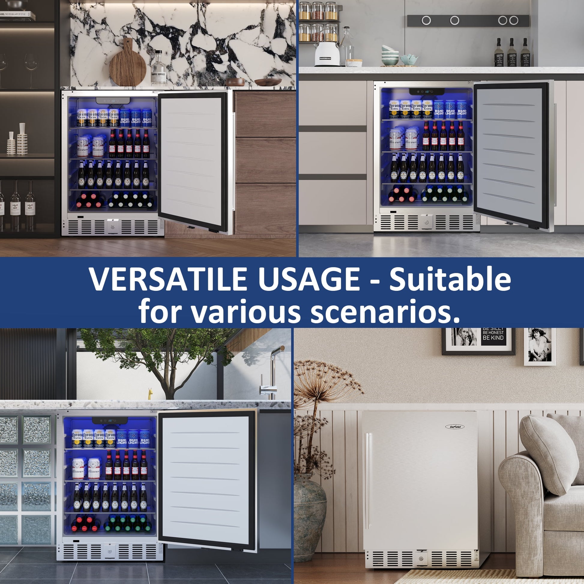 Heynemo 24 Inch Indoor/Outdoor Beverage Refrigerator (32-50¨H), Silver Under Counter Drink Fridge for Patio, Office, Kitchen, Bar, Built-in/Freestanding Can Cooler with Lock & 3 Adjustable Shelves