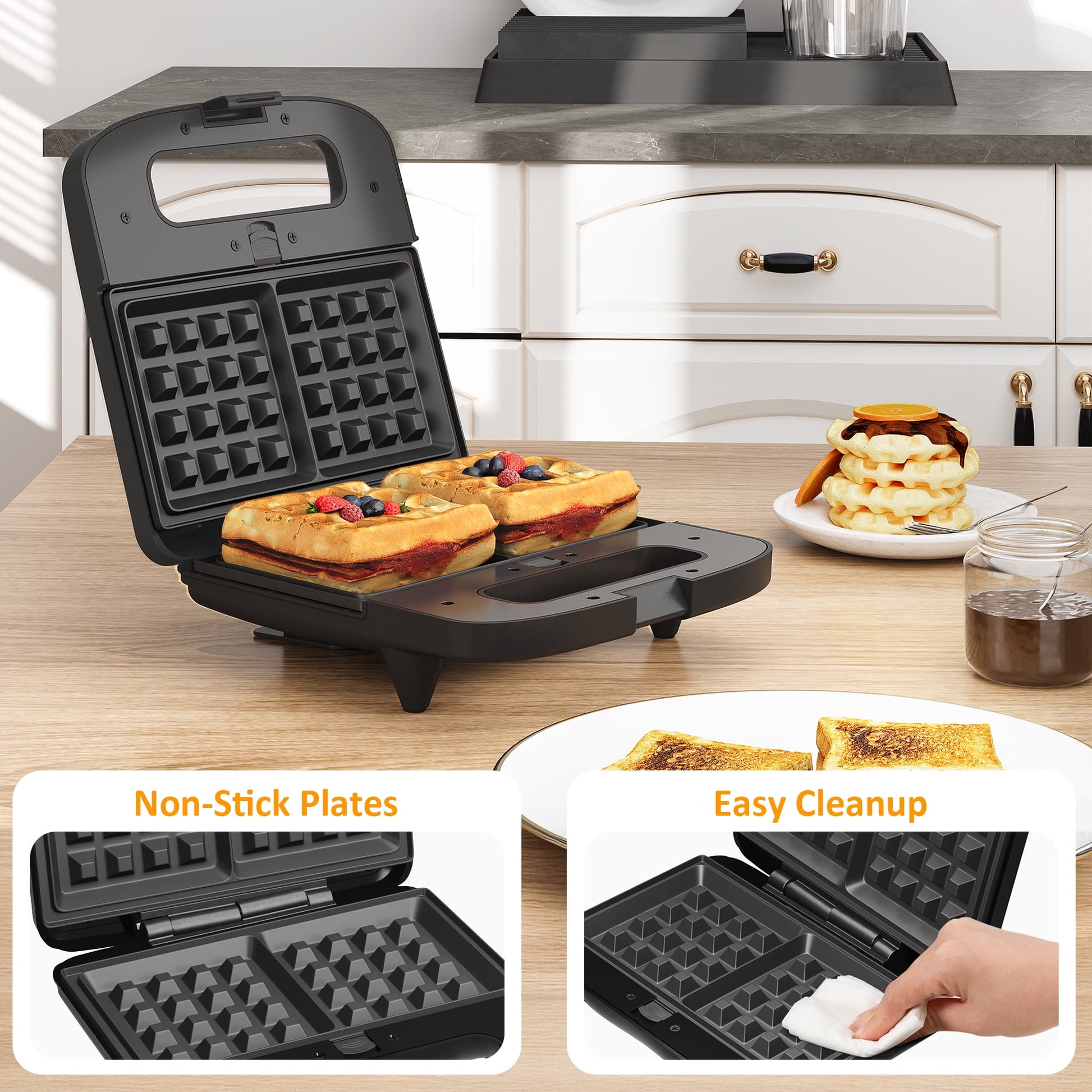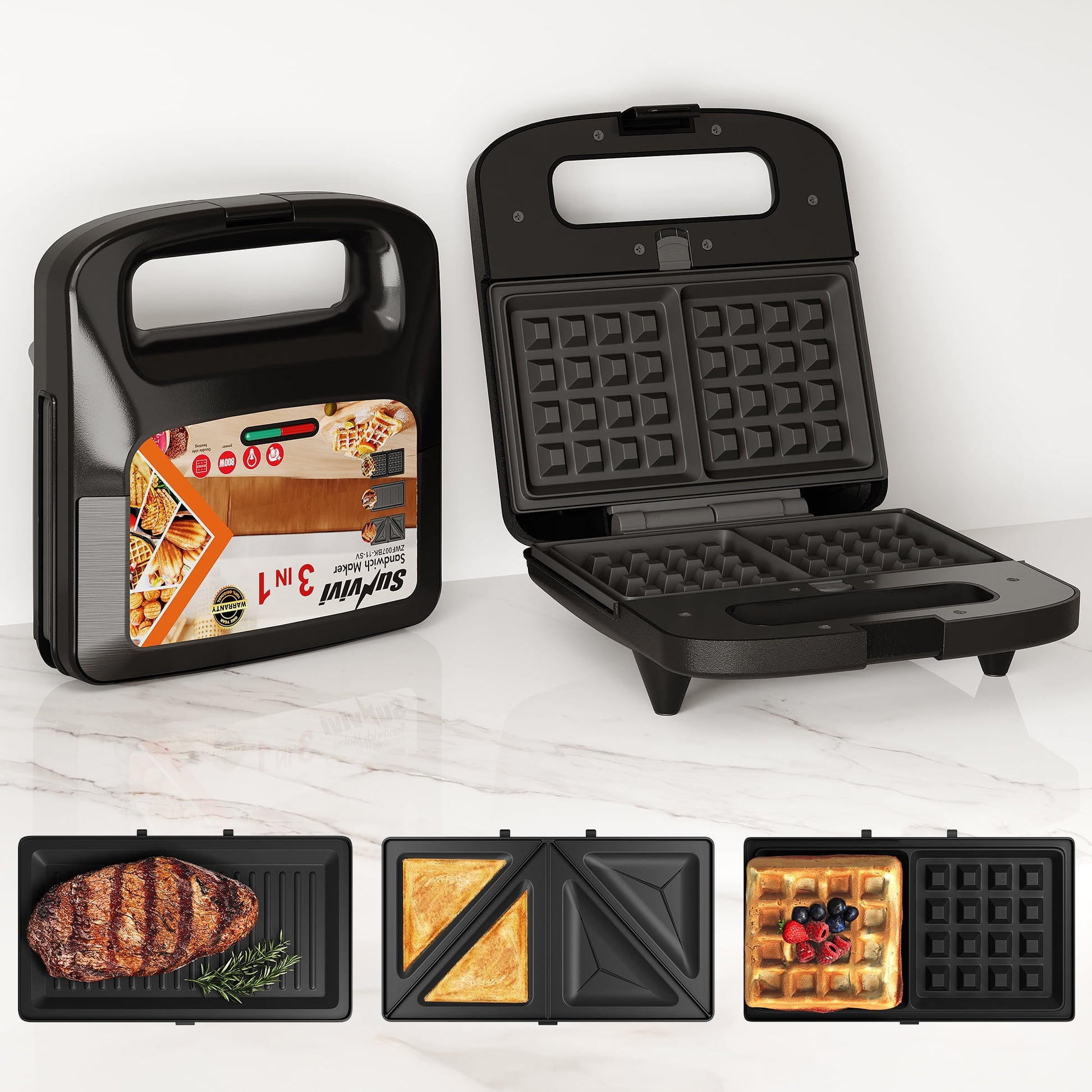 Simplify your mornings with this 3-in-1 sandwich maker¡ªyour all-in-one solution for delicious meals in minutes. From crisp waffles to savory sandwiches and grilled dishes, it lets you enjoy a variety of meals with just one compact appliance. Powered by 800W, it heats up quickly, so you never have to wait long. The non-stick plates make cooking and cleanup effortless, while the cool-touch handle and indicator lights ensure safety and ease. Ideal for small kitchens, camping, or gifting, this portable appliance fits perfectly into any lifestyle. Enjoy the convenience of quick, mess-free meals and kickstart your day with ease!