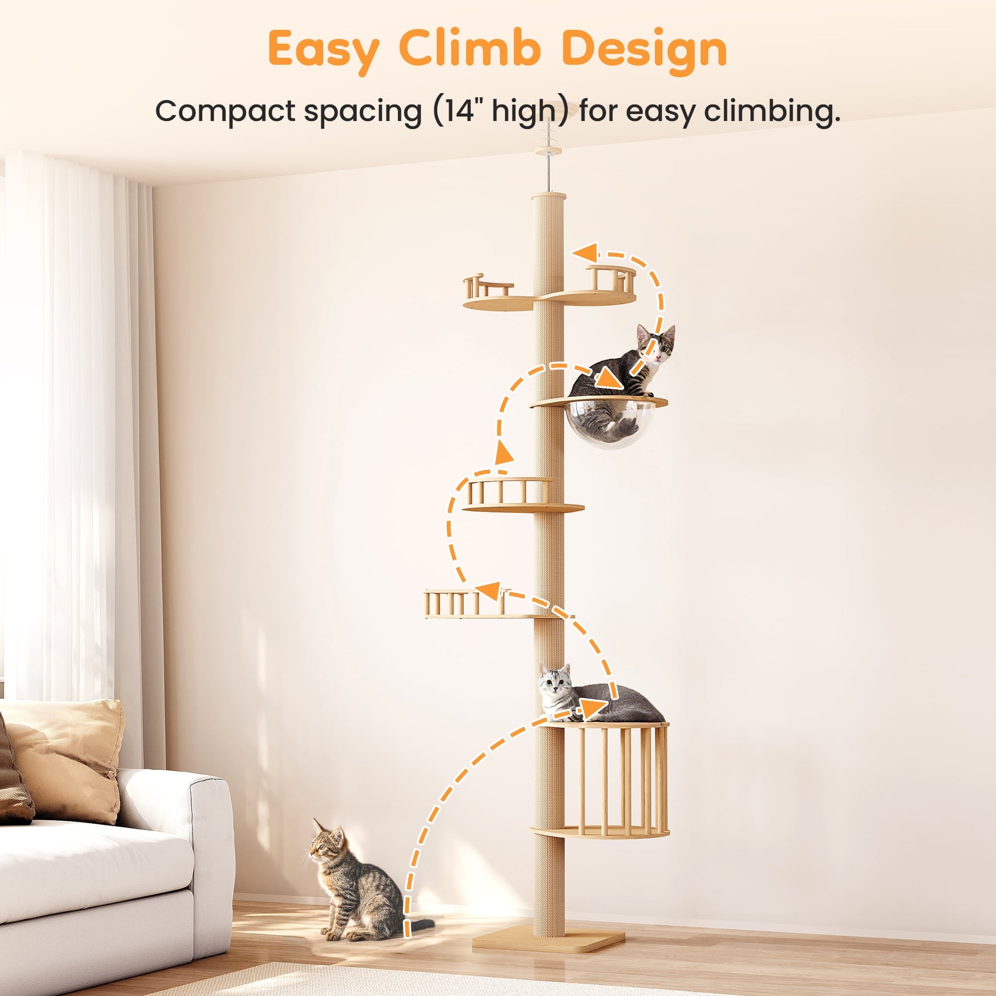 This sleek floor-to-ceiling cat tree offers multiple platforms, scratching posts, railings, and a clear acrylic capsule for climbing, lounging, and play. Its vertical design fits corners and small spaces perfectly. Made with sturdy multilayer board, a wide 15.7"¨G15.7" base, and 7 scratching posts for stability. Adjustable height from 98" to 108" with a spring-loaded top for a secure ceiling fit. Suitable for kittens and senior cats, providing comfort and stimulation. Finished in natural wood tones to complement modern d¹Ècor.