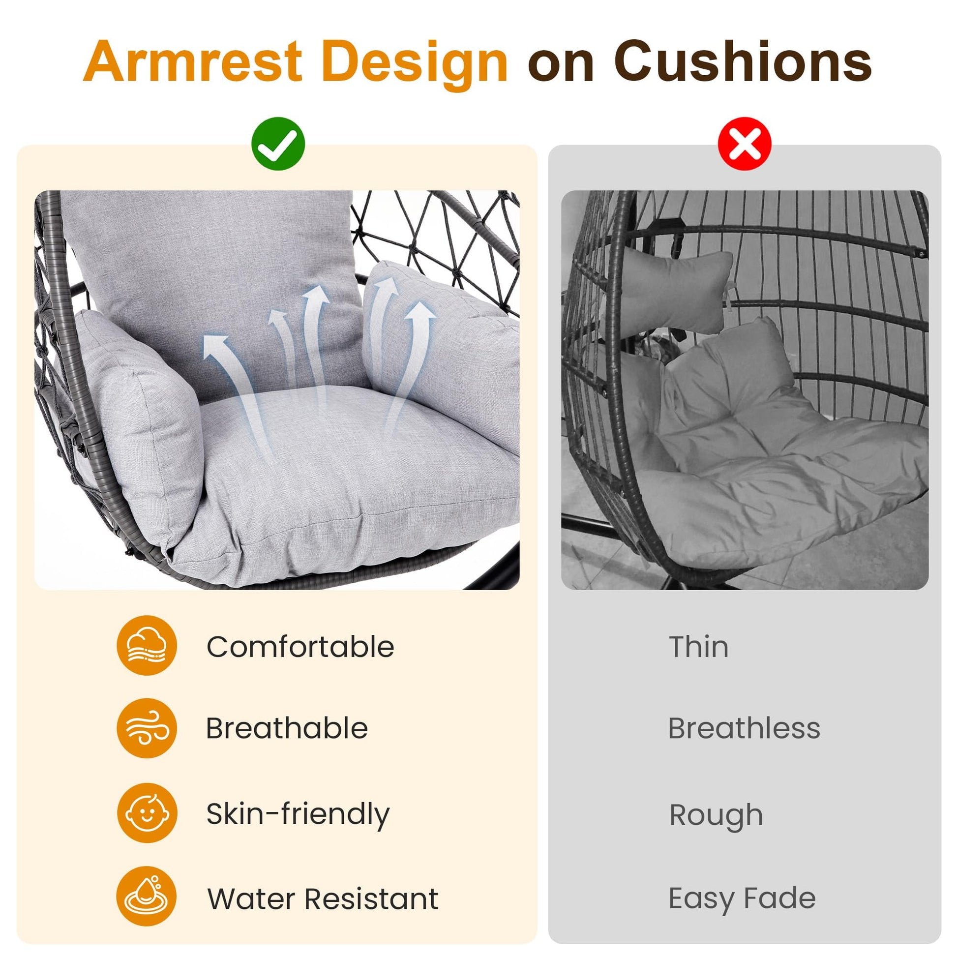 Experience ultimate relaxation with the Heynemo Hanging Egg Chair Outdoor Swing Chair with Stand, a stylish boho egg swing chair perfect for both outdoor and indoor spaces. This wicker rattan hanging chair with stand supports up to 350lbs, making it ideal for your patio, garden, balcony, or bedroom. The sturdy metal frame with a beige finish and durable rattan wrapping ensures long-lasting use, while the plush PP cotton cushion and headrest provide exceptional comfort for lounging or reading. The adjustable suspension chain lets you customize your seating height for a personalized relaxation experience. Easy to assemble and portable, this indoor hammocks chair with stand features a folding design for convenient storage and movement. The weather-resistant materials make it suitable for year-round enjoyment, and the included accessories ensure a hassle-free setup. Whether you¡¯re looking to create a cozy retreat indoors or a chic outdoor oasis, the Heynemo hanging egg chair is a versatile addition to your home, blending boho style with modern comfort for a unique seating solution.