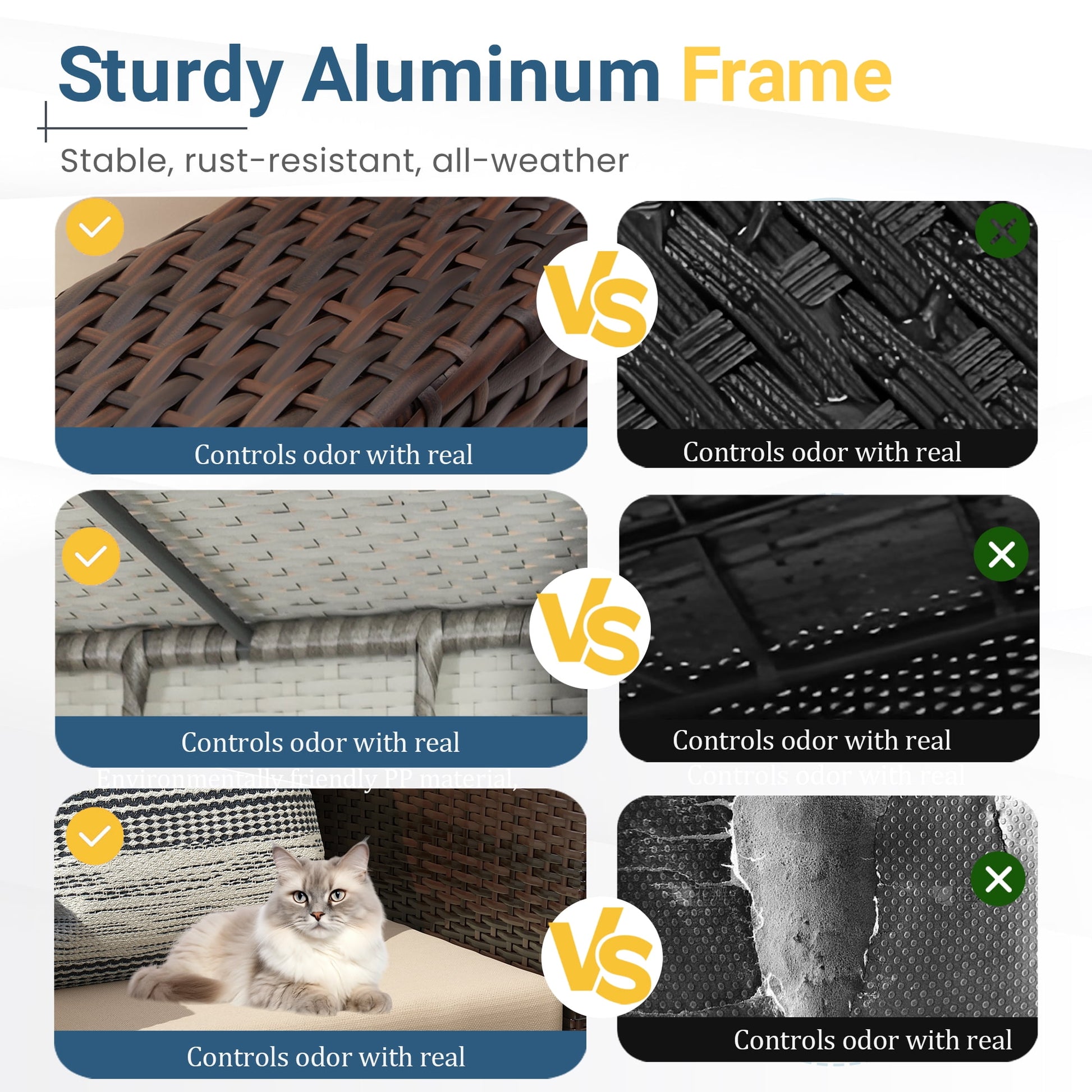 This patio furniture set is made of a strong galvanized steel frame that significantly improves the stability of the couch. Hand-woven PE rattan has a smooth surface and the wooden tabletop of the outdoor dining set is stable. Ensuring the outdoor furniture sectional can be used for a long time.