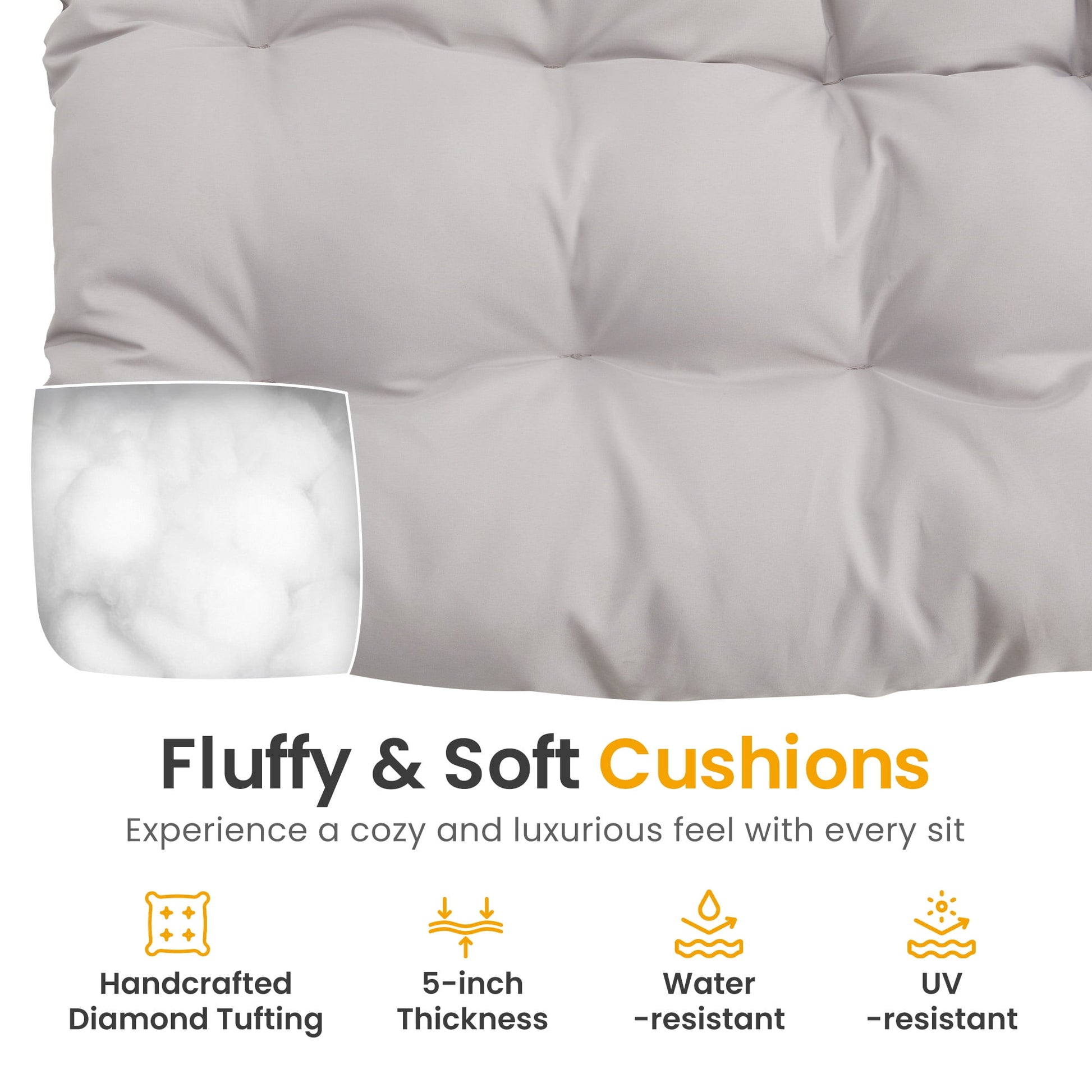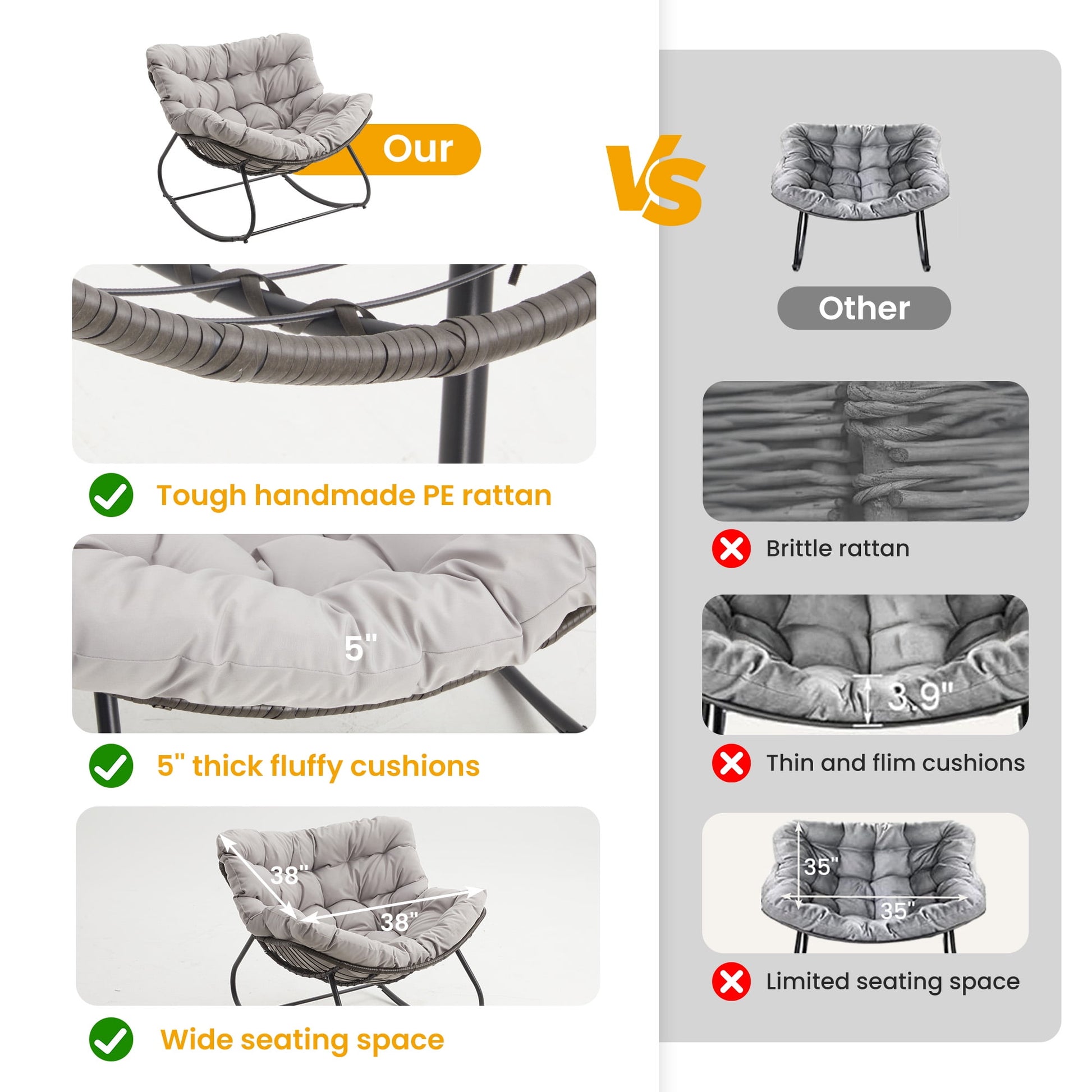 Relax in our egg-shaped Papasan rocking chair, designed to fit your body's natural curves for maximum comfort. The 5-inch thick cushion provides great support, while the smooth 30-degree rocking motion gently soothes you. Perfect for curling up with a book on the porch, enjoying a sunny afternoon in the garden, or taking a peaceful nap in the backyard, this chair offers the ultimate in outdoor relaxation.
