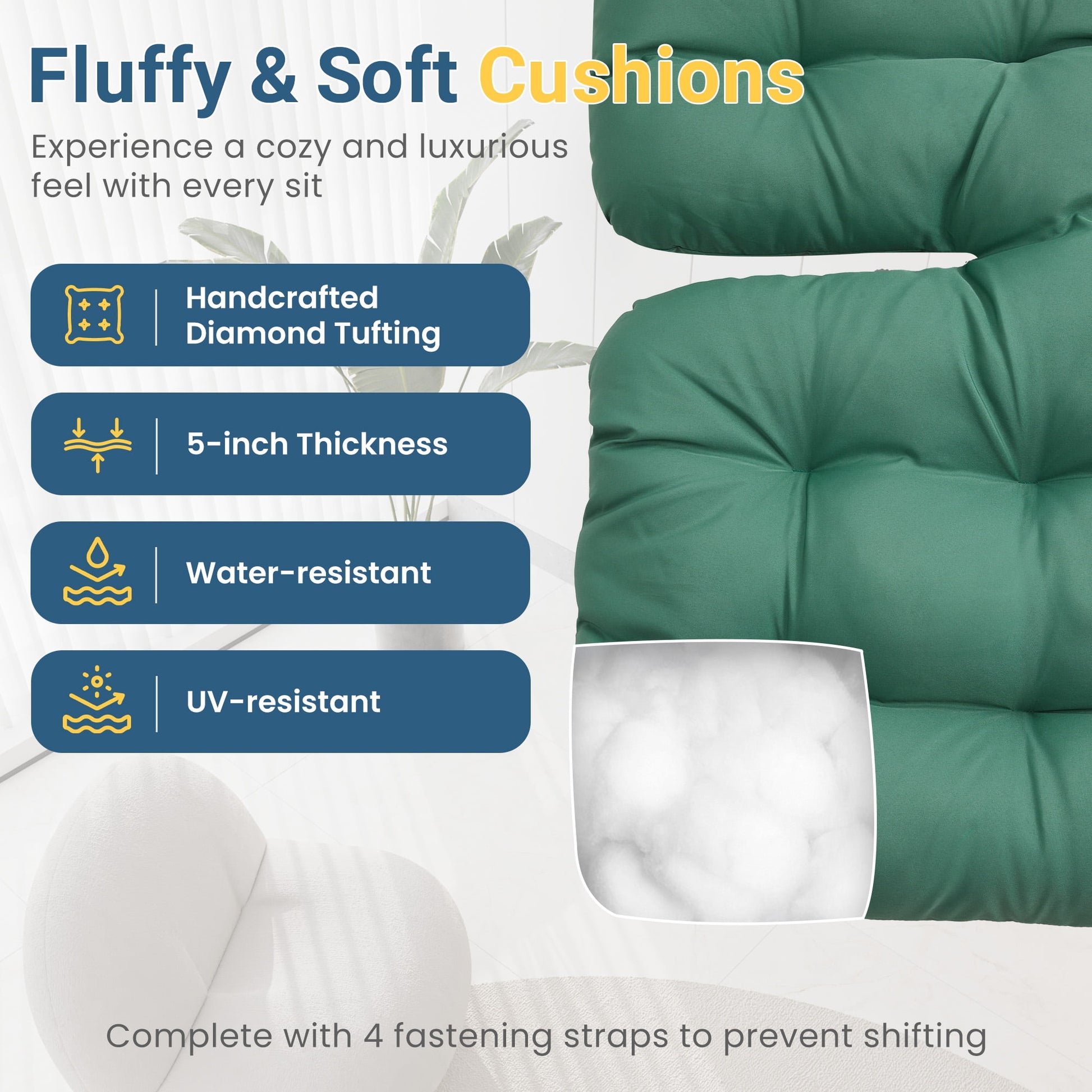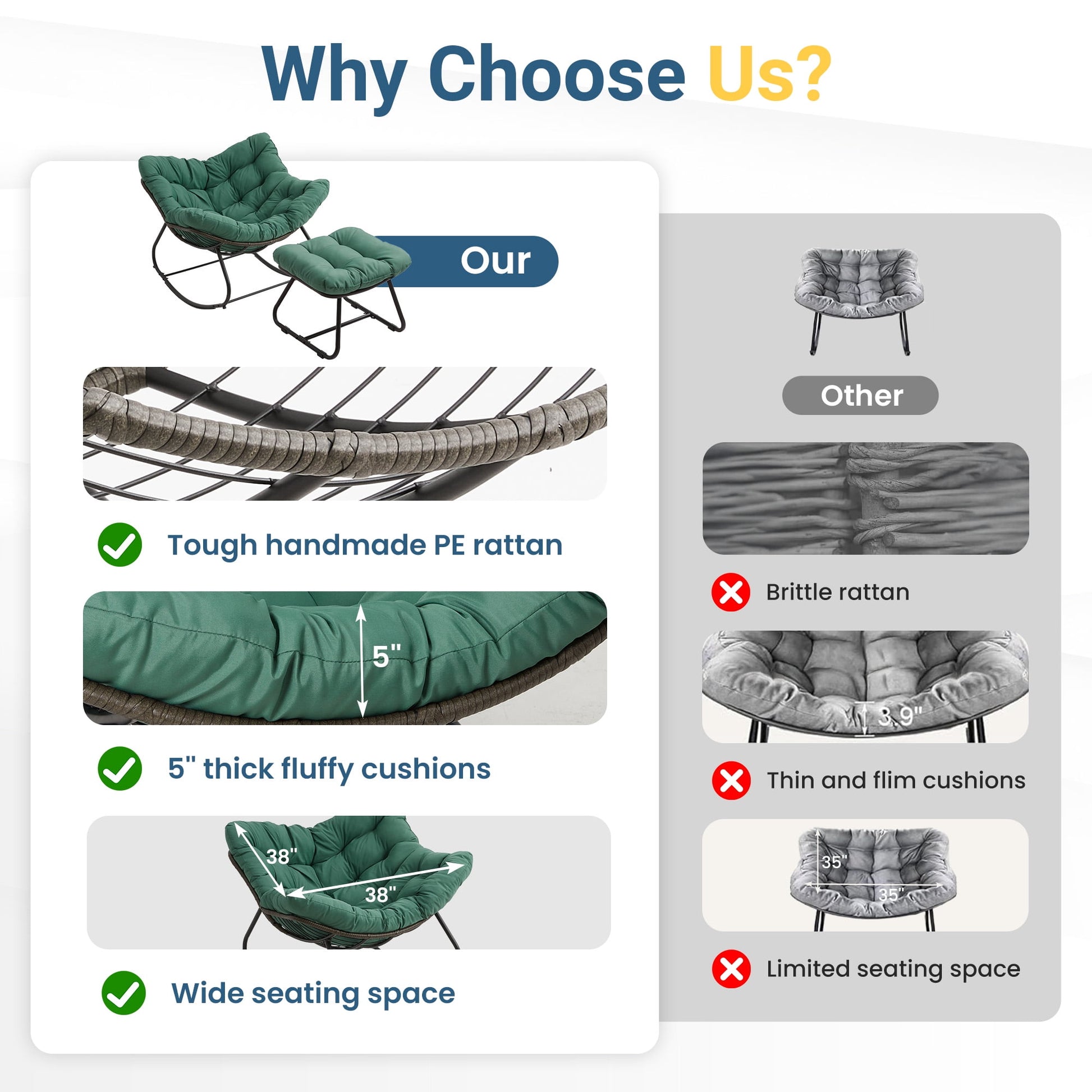 Relax in our egg-shaped rocking chair, designed to fit your body's natural curves for maximum comfort. The 5-inch thick cushion provides great support, while the smooth 30-degree rocking motion gently soothes you. Perfect for curling up with a book on the porch, enjoying a sunny afternoon in the garden, or taking a peaceful nap in the backyard, this chair offers the ultimate in outdoor relaxation.