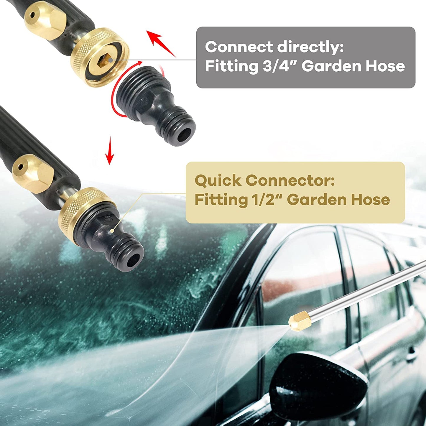 2 WAYS TO CONNECT HOSE - Fits all 3/4" standard garden hoses, as well as other sizes of standard 1" hose connectors. Equipped with a standard garden hose quick connector, the high pressure wash wand also fits well with 1/2" standard garden hose.