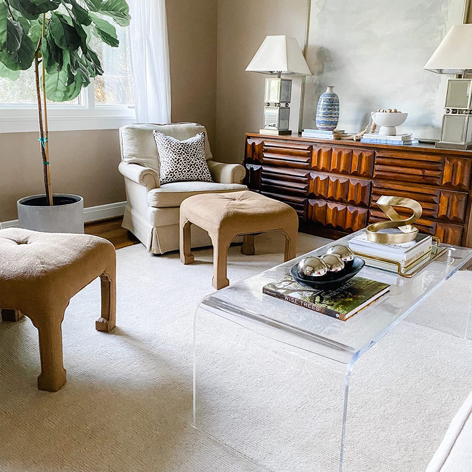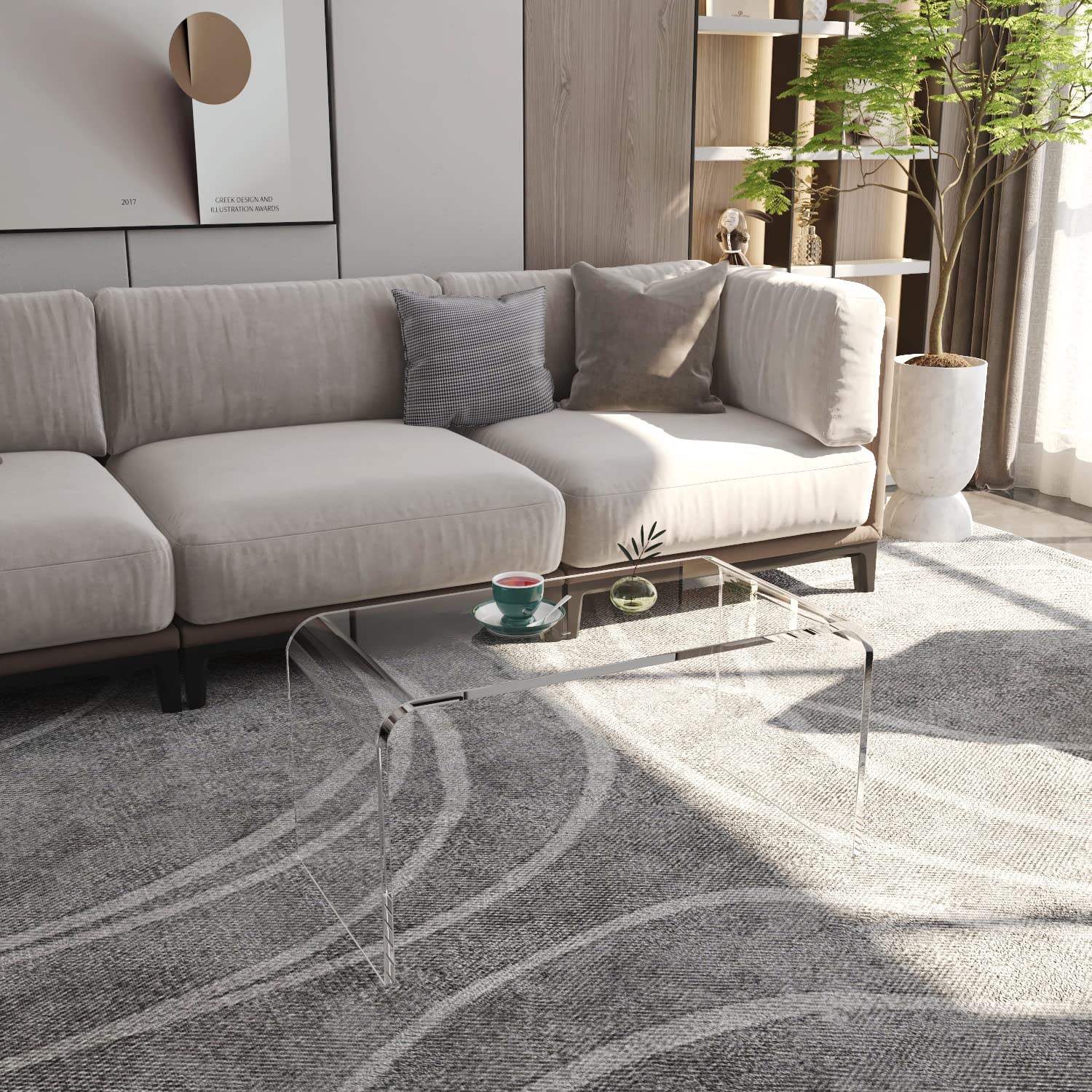 ELEGANT DESIGNThis 100% acrylic coffee table is U-shaped design which looks modern and simple. Super clear surface and edges, produce a visually lighter and purer effect. This generous acrylic coffee table will match all styles of home decor.