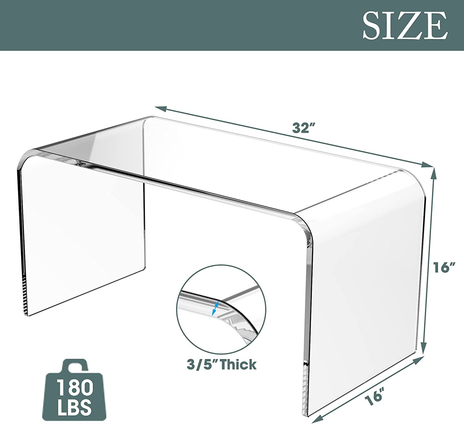 PRODUCT DETAILSOverall Dimension: (L)32"x (W)16"x (H)16". Thickness: 3/5" (15mm). Maximum weight capacity: 180 lbs. The acrylic coffee table is one solid piece, assembly is not required. Safe in daily designed with smooth rounded edges.