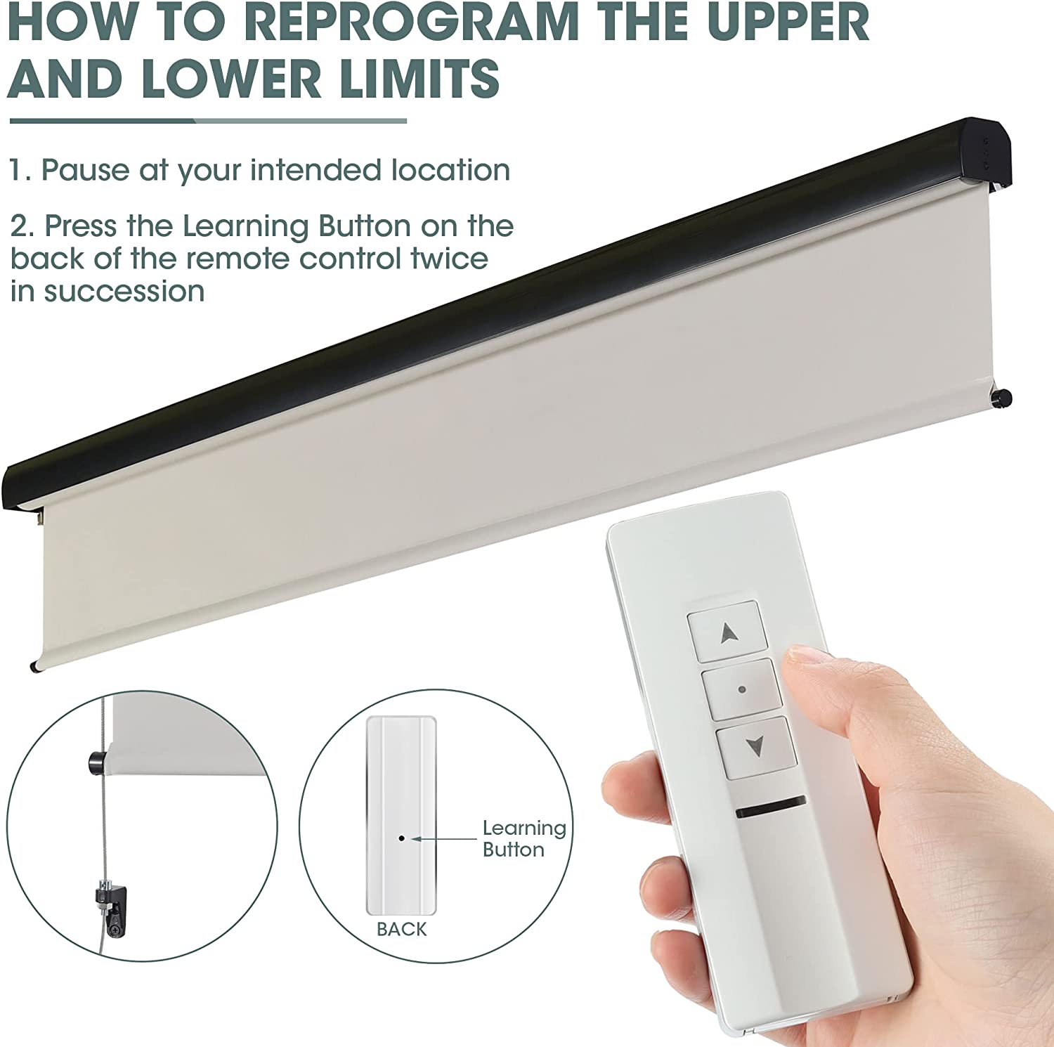 Electric Roll Up Shades Our Motorized Roller Shade has a power of 103W and requires an input voltage of 110-120V to power it. Motorization allows for easy opening and closing of single or multiple window treatments from a handheld remote. About how to reprogram the upper and lower limits, you only need to pause at your intended location, then press the Learning Button on the back of the remote control twice in succession.