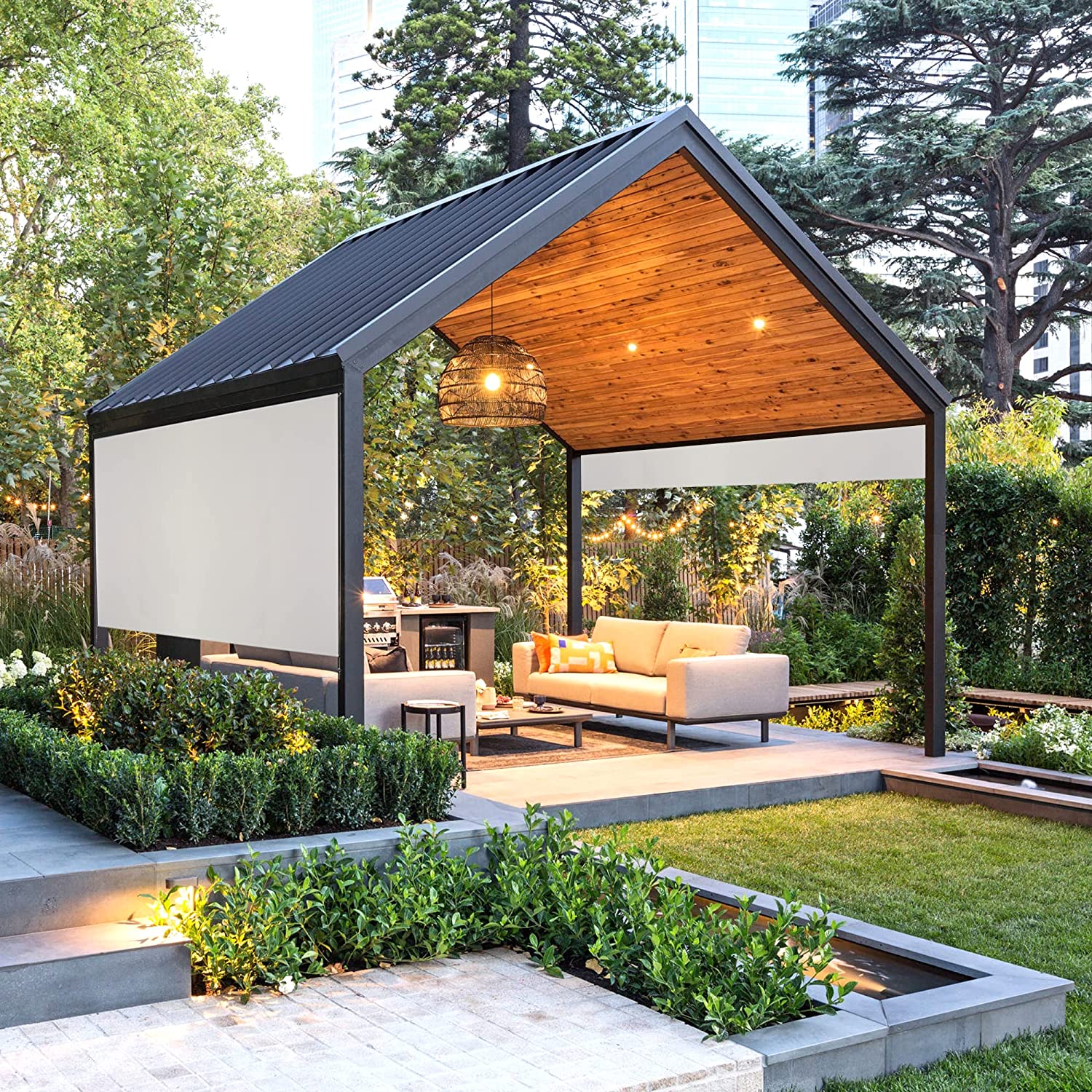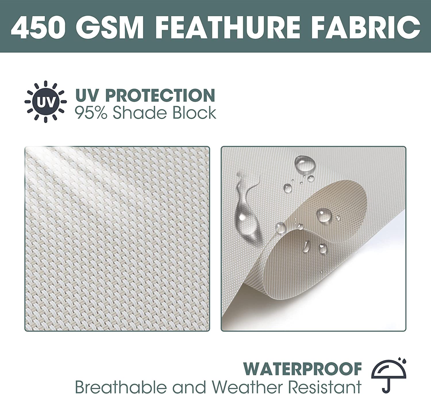 Durability Material Our motorized outdoor roll up blinds are made of 450GSM 70% PVC & 30% polyester material and up to 95% UV block, breathable and weather resistant. Outdoor automatic patio blinds shades can effectively shield you from the scorching sun, dust and rain, bringing you comfort, coolness and privacy protection.
