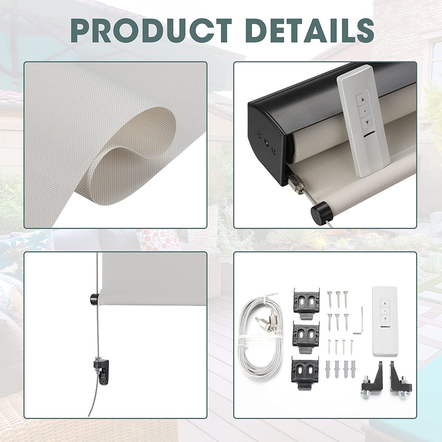 Wide Use The electric pull down shades are not only works for outdoor occasions such as deck, balcony, porch, pergolas, they are also suitable for the windows of living room, bedroom, study room, restaurant, business area and etc. Cordless design of our motorized roll up sun shade is friendly to your home environment, children and pets.