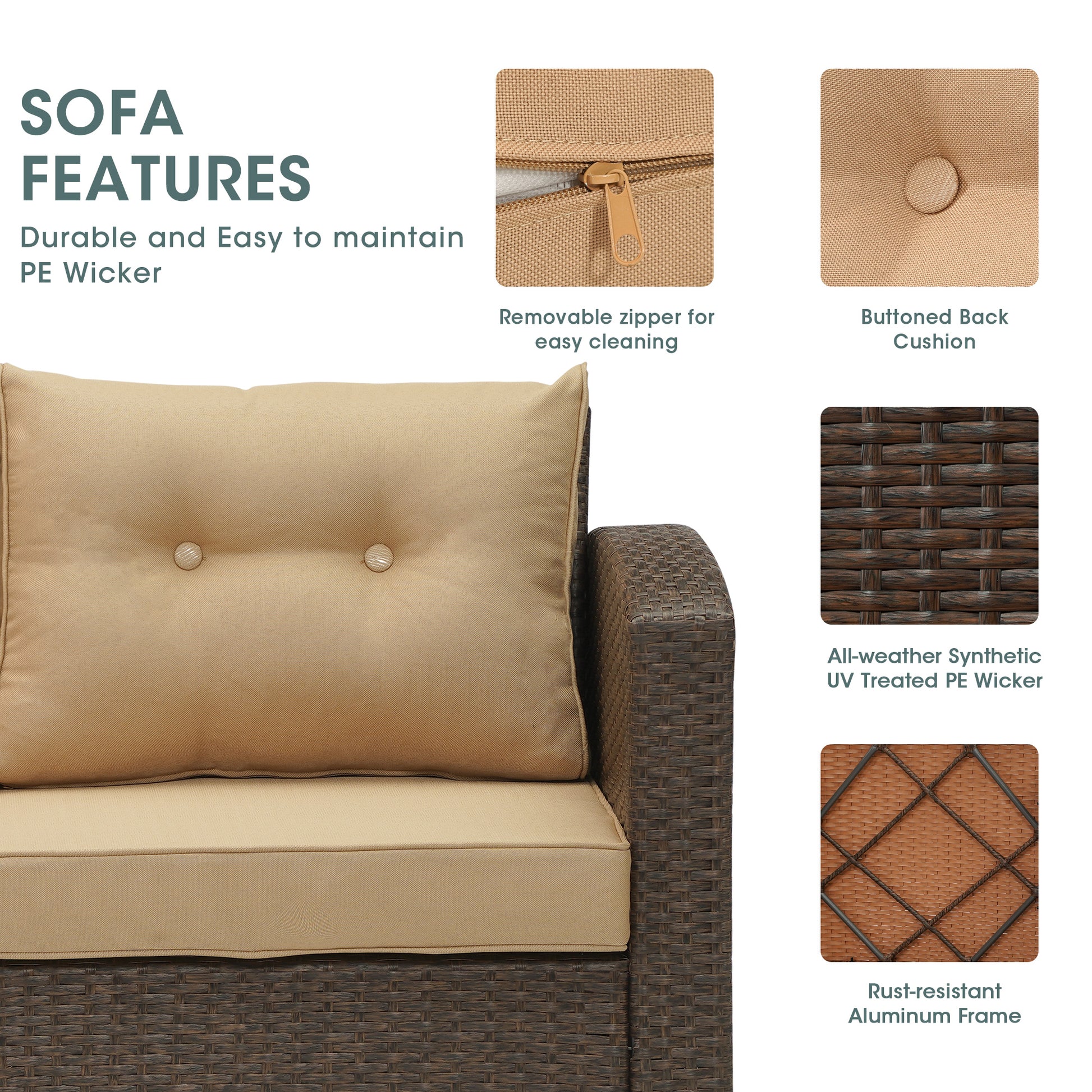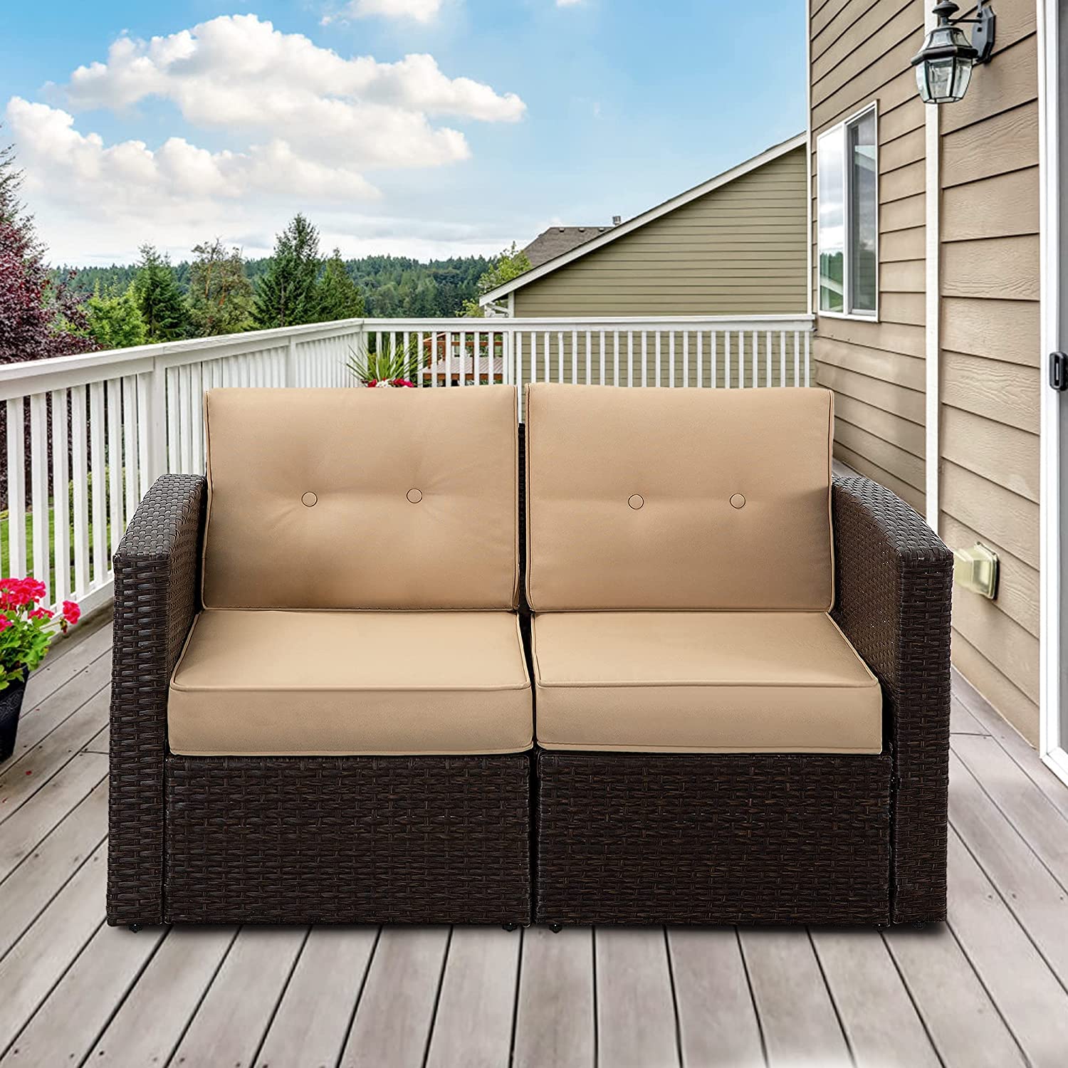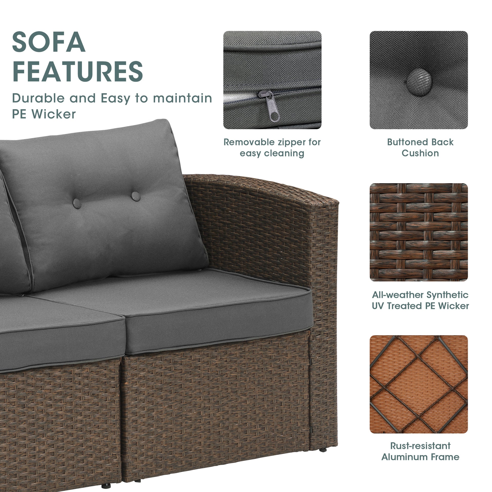 Outdoor Loveseat Patio Furniture Corner Sofa, All-Weather Brown Wicker 2-Piece Rattan Outdoor Sectional Couch Sofa Set with Non-slip Cushions,Aluminum Frame