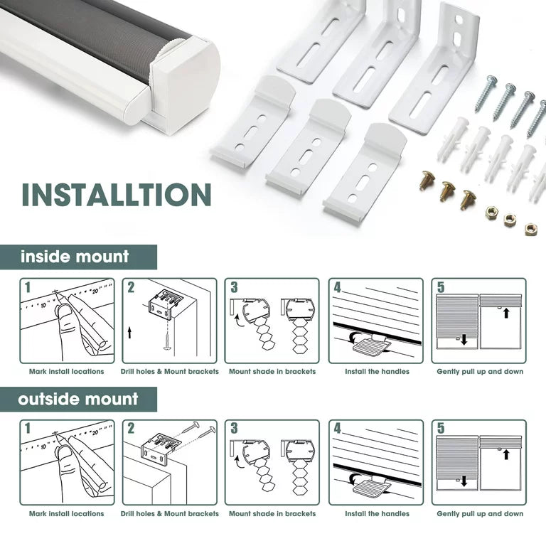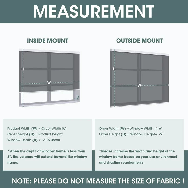 Environmental Protection: The introduction of ultra-high technology. Without benzene and formaldehyde, it is safer.Safety: High-quality polyester fiber, non-toxic and tasteless is the best choice for you and your family.Enjoy: For the ultimate experience, you can install it on the windows of any room, whether it is to block the sun or match your room style, our window shades are your best choice! Measurement Guide for the Perfect FitRoyalcraft zebra roller shades can be used for either inside mount or outside mount. When inside mount, order width=window width-0.1"" . When outside mount, order width=window width+1-6"" .It is very important that you watch the instructions carefully and take the measurements exactly to get the right size.