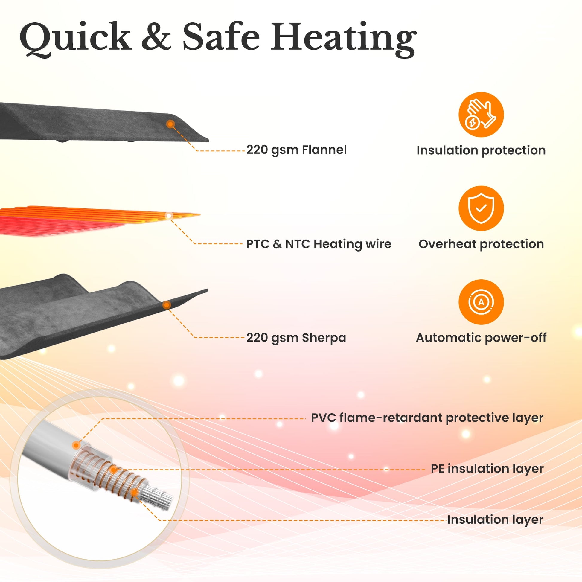 Royalcraft Heated Blanket King Size, Electric Throw Dual Control , 10 Heat Settings, 12 Hours Auto Off, Soft Flannel and Sherpa, Machine Washable , Grey