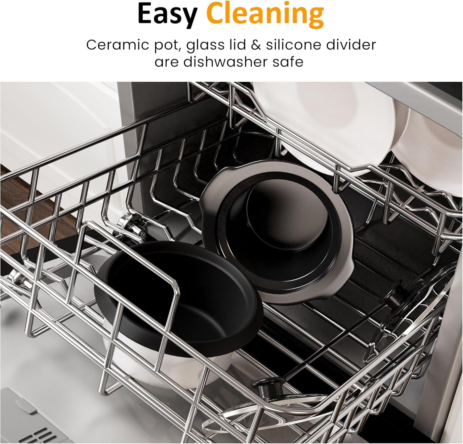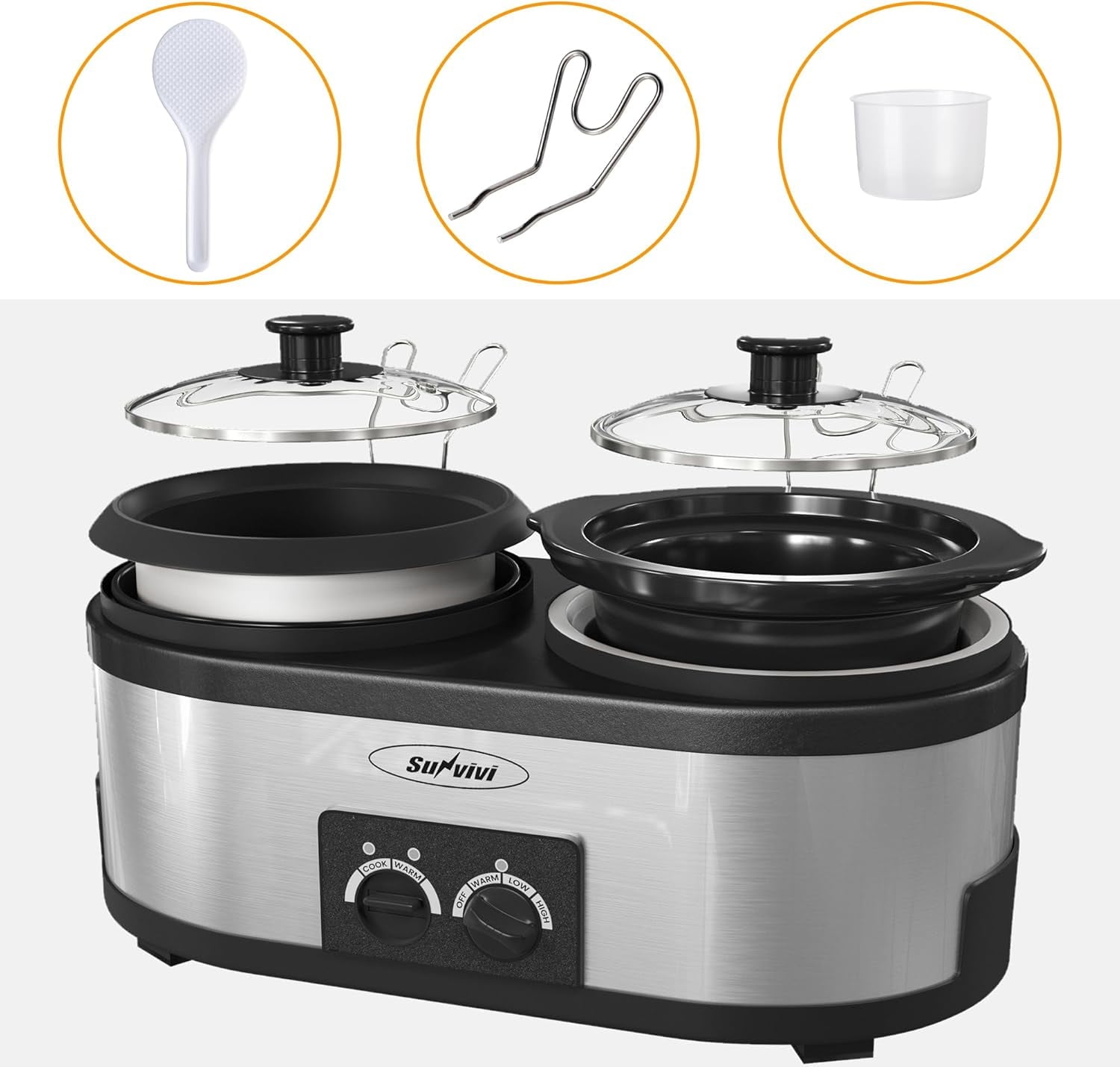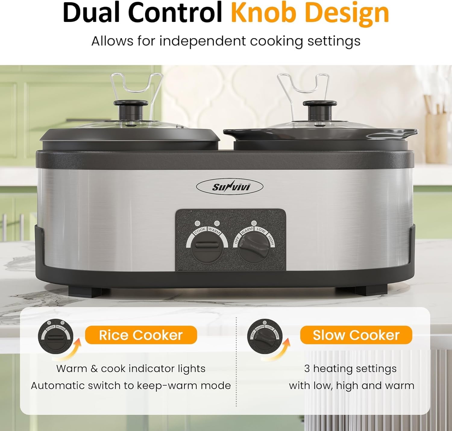 Sunvivi 2 in 1 Slow Cooker and Rice Cooker, Multi Slow Cooker with 1.5 QT Ceramic Pot & 3 Cup Rice Cooker , Non-Stick Aluminum Pot & Indicator Lights, Dual Control Knob, Stainless Steel