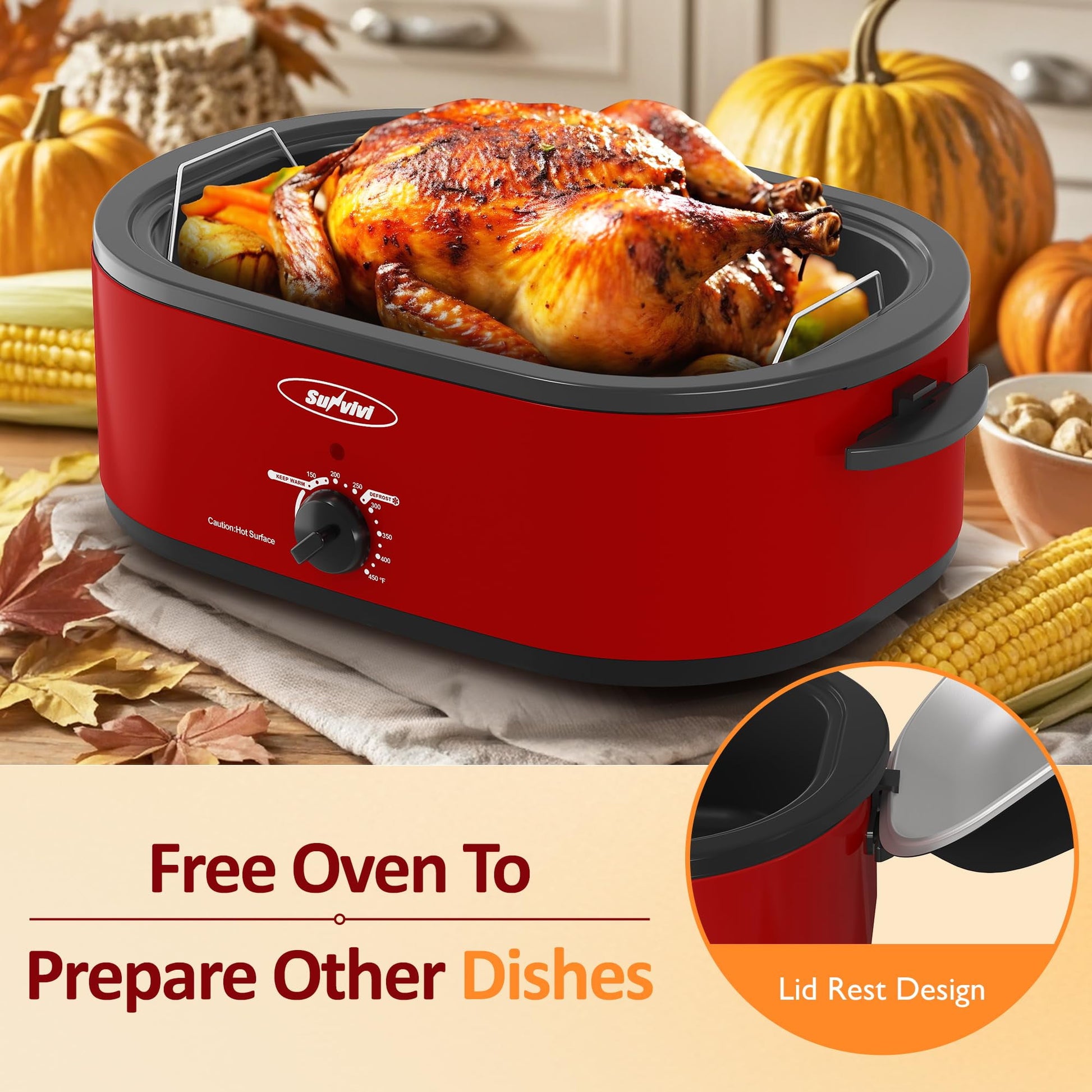Sunvivi 20 Quart Electric Roaster Oven Turkey Roaster with Lid Electric Roasters with Removable Pan Large Roaster,Self-Basting Lid,Fast Heating & Thaw/Warming Setting,Red