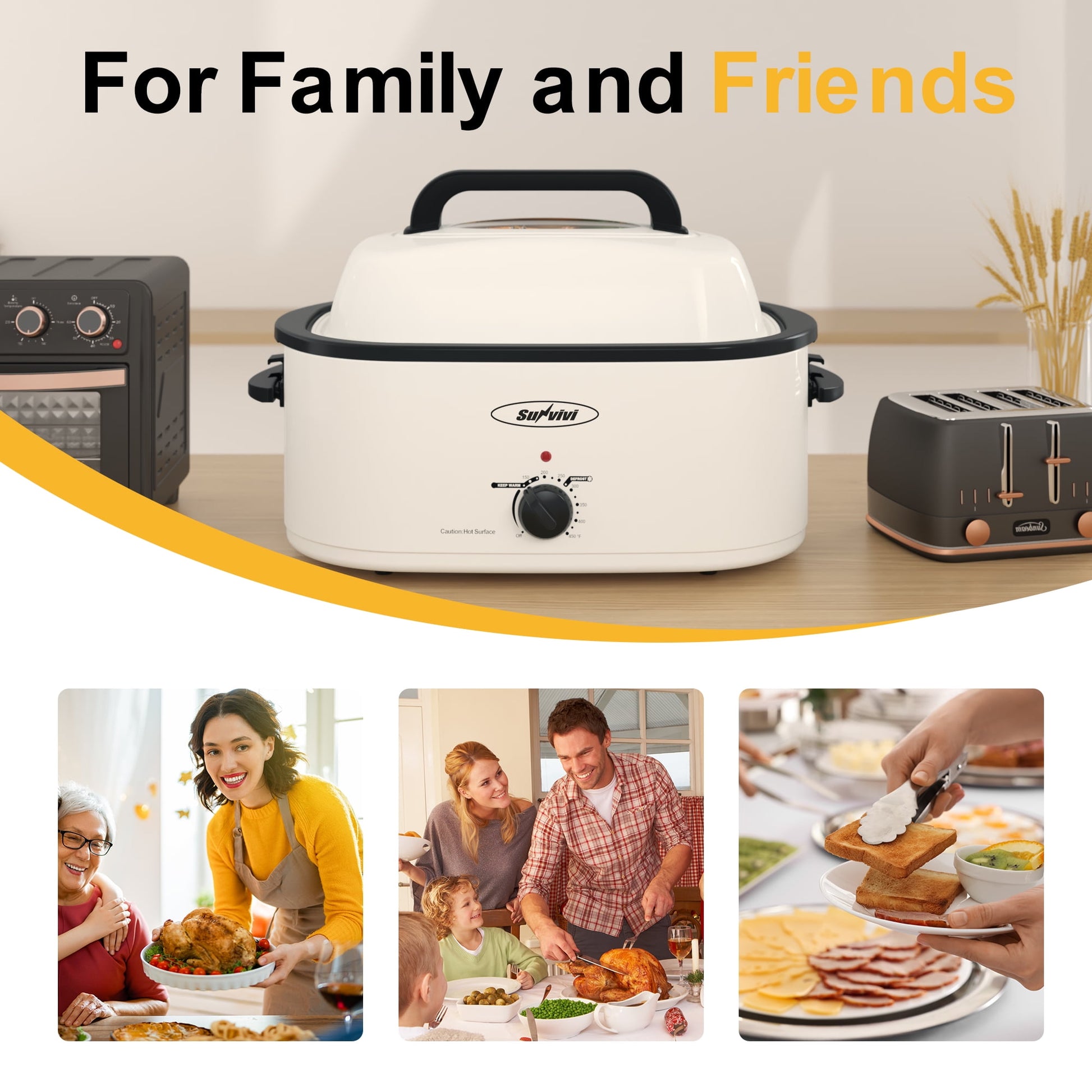 Prepare tender turkey, slow-cooked stews, and more with this stainless steel roaster oven. Sunvivi 22qt self-basting roaster are simple to use, helping you make holiday and special occasion meals that are moist, tender, and delicious easily. You could save time and energy with this multi-roaster. Adjustable temperature control from 150o to 450oF lets you do everything from keeping a side dish warm to roasting a large turkey. This electric Turkey roaster oven includes a removable stainless steel inner rack to easily lift out heavy items. After the meal is complete, simply remove the enameled steel baking pan for easy clean up. So, let's get cooking! It's time to explore all the wonderful ways to get the most out of your roaster oven for years to come.