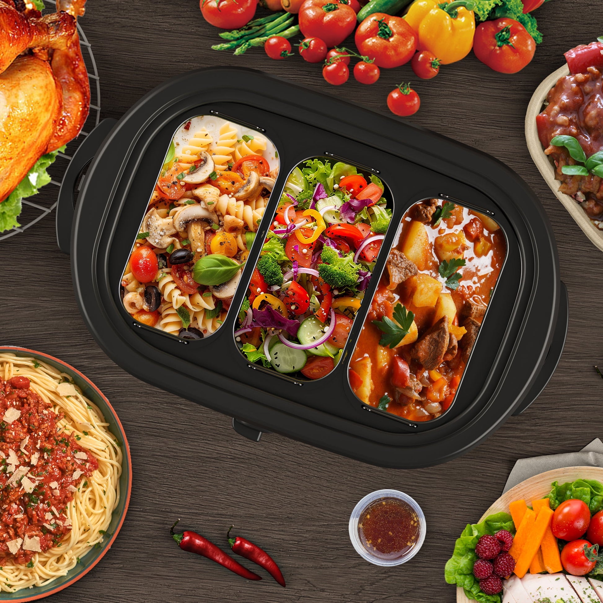The Sunvivi Electric Roaster Oven, 24 QT Roaster with 3 Compartments and Self-Basting Lid, is your ultimate kitchen multitasker for effortless meal prep. This versatile electric roaster oven is perfect for roasting, baking, slow cooking, and reheating, making it ideal for family dinners, holiday gatherings, and parties. The included buffet server features three separate compartments, allowing you to cook and keep multiple dishes warm at once, from turkey and chicken to side dishes like mashed potatoes and vegetables. With a full-range adjustable thermostat from 150 to 450¡ãF, you can easily defrost frozen foods or maintain the perfect serving temperature. The self-basting lid helps lock in moisture for juicy results, while anti-scald handles provide added safety during use. Cleanup is simple with a liftable rack and dishwasher-safe removable roasting pan and buffet trays. Designed with a durable stainless steel body and enamel pan, this 24-quart roaster oven combines convenience, versatility, and easy care, making it a must-have for any home chef looking to streamline cooking and serving.