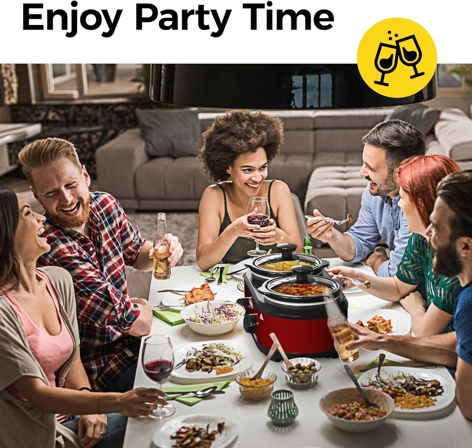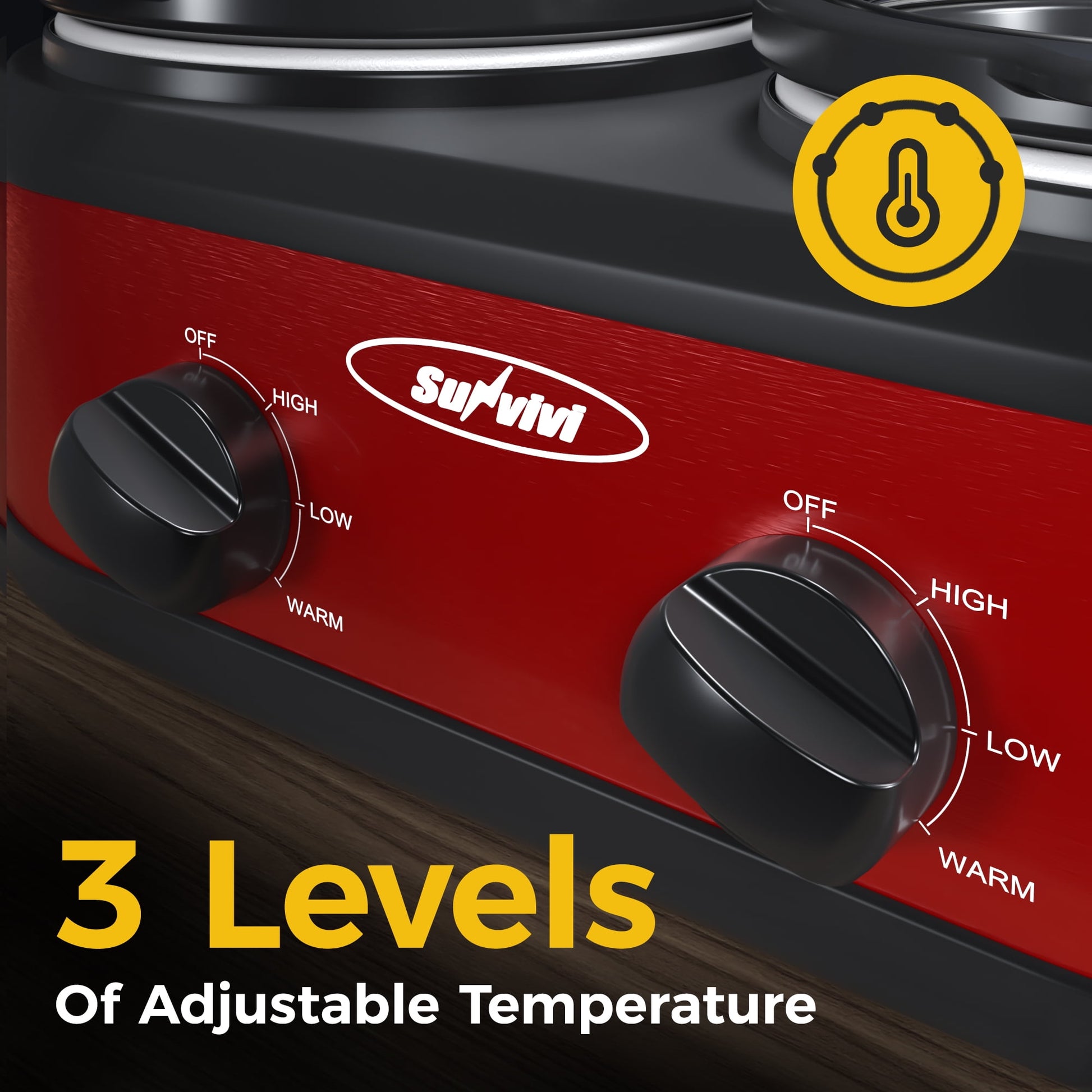 Sunvivi Double Slow Cooker,2 Pot Small Mini Crock Buffet Servers and Warmer,Dual Pot Oval Manual Slow Cooker with Adjustable Temp Removable Ceramic Pot,Stainless Steel, Total 2.5 Quarts Red