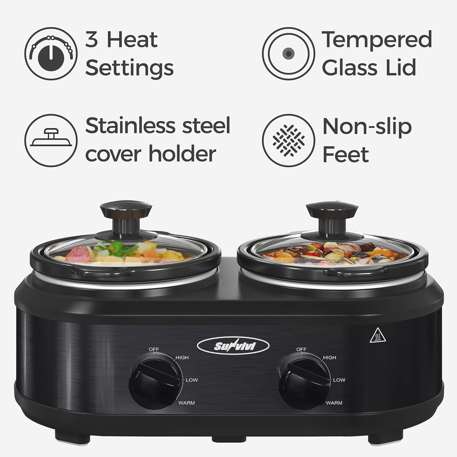 Discover the Sunvivi Double Slow Cooker, a versatile kitchen essential designed for convenience and efficiency. This dual slow cooker features two removable ceramic pots, each with independent temperature controls, making it perfect for preparing multiple dishes at once. With a total capacity of 2.5 quarts, it¡¯s ideal for small families, entertaining guests, or meal prepping. The oval slow cookers design ensures even heating, while the stainless steel finish adds a modern touch to your countertop. Whether you¡¯re looking for slow cookers 2 qt, 2.5 qt slow cookers, or small slow cookers on sale 2 quart, this model offers the flexibility you need. The Sunvivi Double Slow Cooker is easy to clean, with dishwasher-safe pots and lids, and features a compact, space-saving shape. Enjoy effortless cooking for parties, buffets, or everyday meals with this dual slow cooker, perfect for keeping food warm and ready to serve. Backed by a 365-day warranty, this slow cooker is a practical addition to any kitchen, offering reliable performance and stylish design for all your cooking needs.