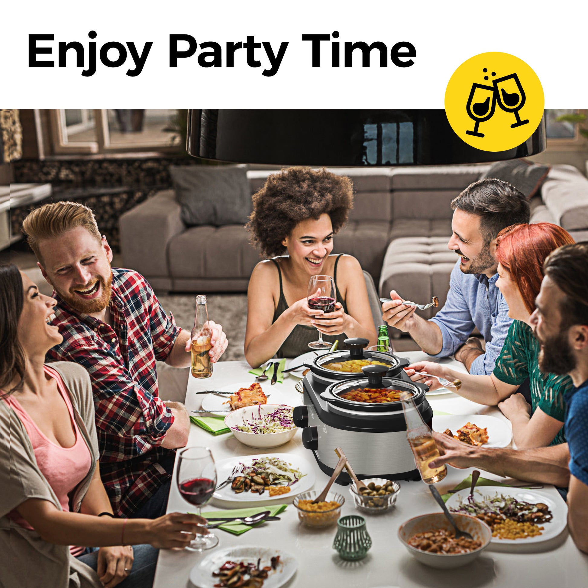SUNVIVI double slow cooker is a kitchen appliance that can be used by anyone who enjoys cooking and wants to save time and energy. Two separate dishes can be prepared and served at the same time. Perfect for Meal sellers, Busy professionals and Health-consucious individuals. As a buffet warming server, it will be a welcome addition during any family gathering or holiday. The electric slow cooker features a non-stick, removable and stain proof stoneware crock insert ideal for easy prepping, serving and cleaning! There are 2 separate ceramic pots, allowing you to cook 2 different dishes at the same time. The two pot can be set to high, low temperature or keeping warm individually according to the ingredients you want to stew, ensuring your food cooked in the best cooking condition. The transparent lids allows you to view the condition of the food easily. The stainless steel pots are removable for easy cleaning. The lid and stoneware can be washed in the dishwasher or with hot, soapy water. This SUNVIVI 2 x 1.25 QT Crock Pot Food Warmer is ideal for office parties, family functions, and other social events, compact design perfect for camping, outdoors, etc..