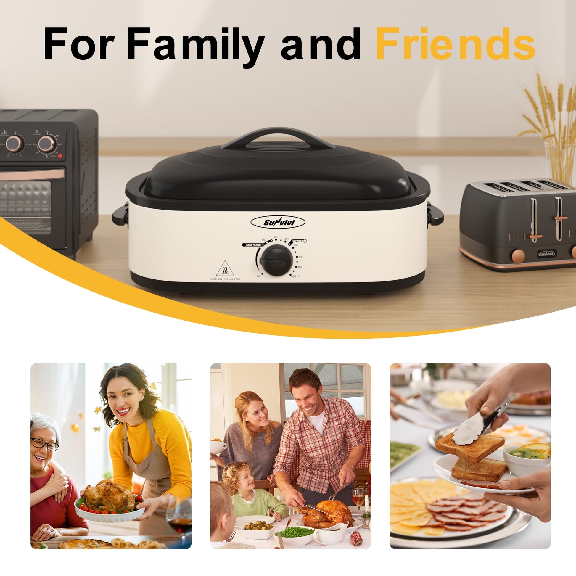 Sunvivi Roaster Oven with Self-Basting Lid, 14qt Electric Roaster with Removable Pan & Rack, Turkey Roaster Oven with Defrost & Warm Function, Stainless Steel, White