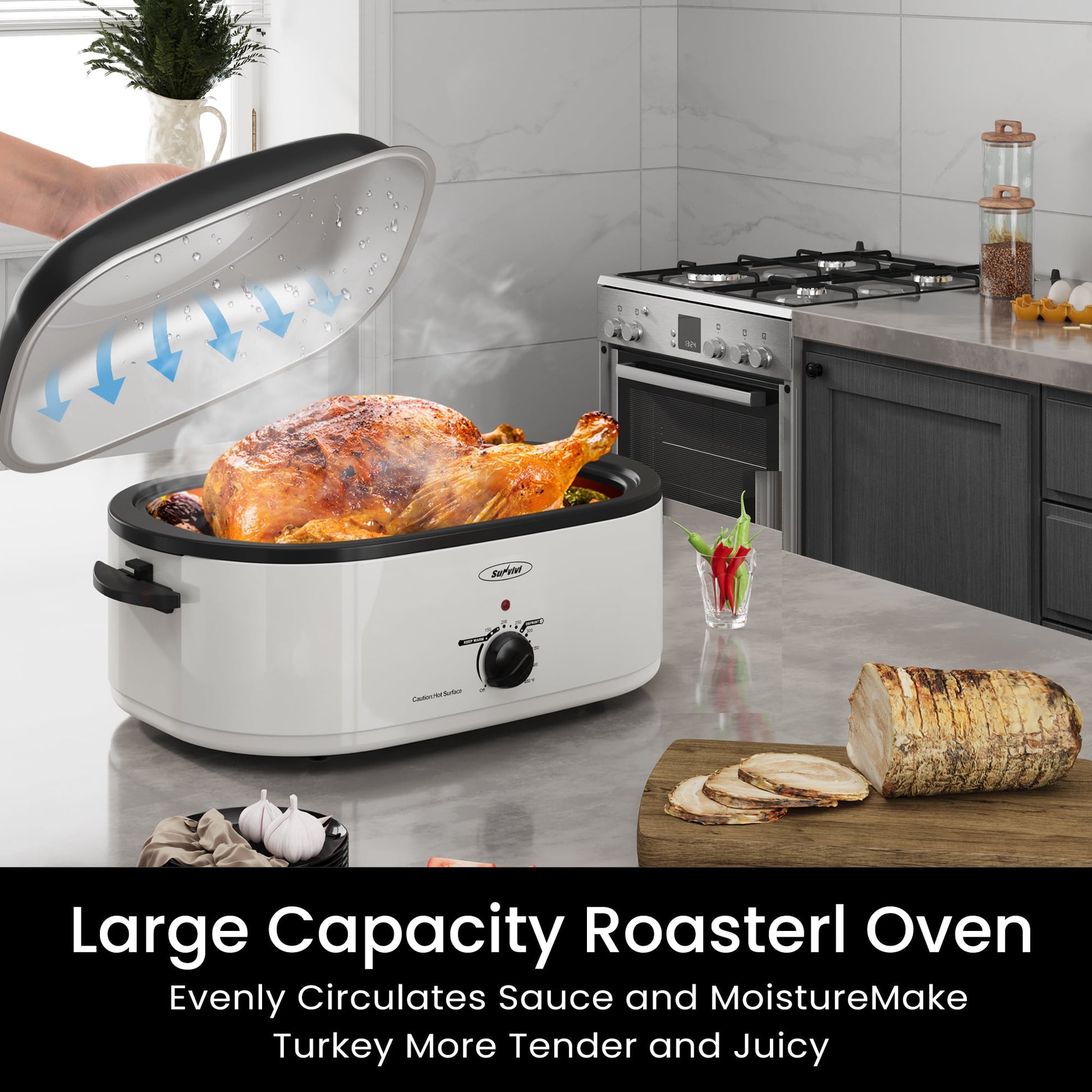 Sunvivi Roaster Oven with Self-Basting Lid, 20qt Electric Roaster with Removable Pan & Rack, Turkey Roaster Oven with Defrost & Warm Function, Stainless Steel, White